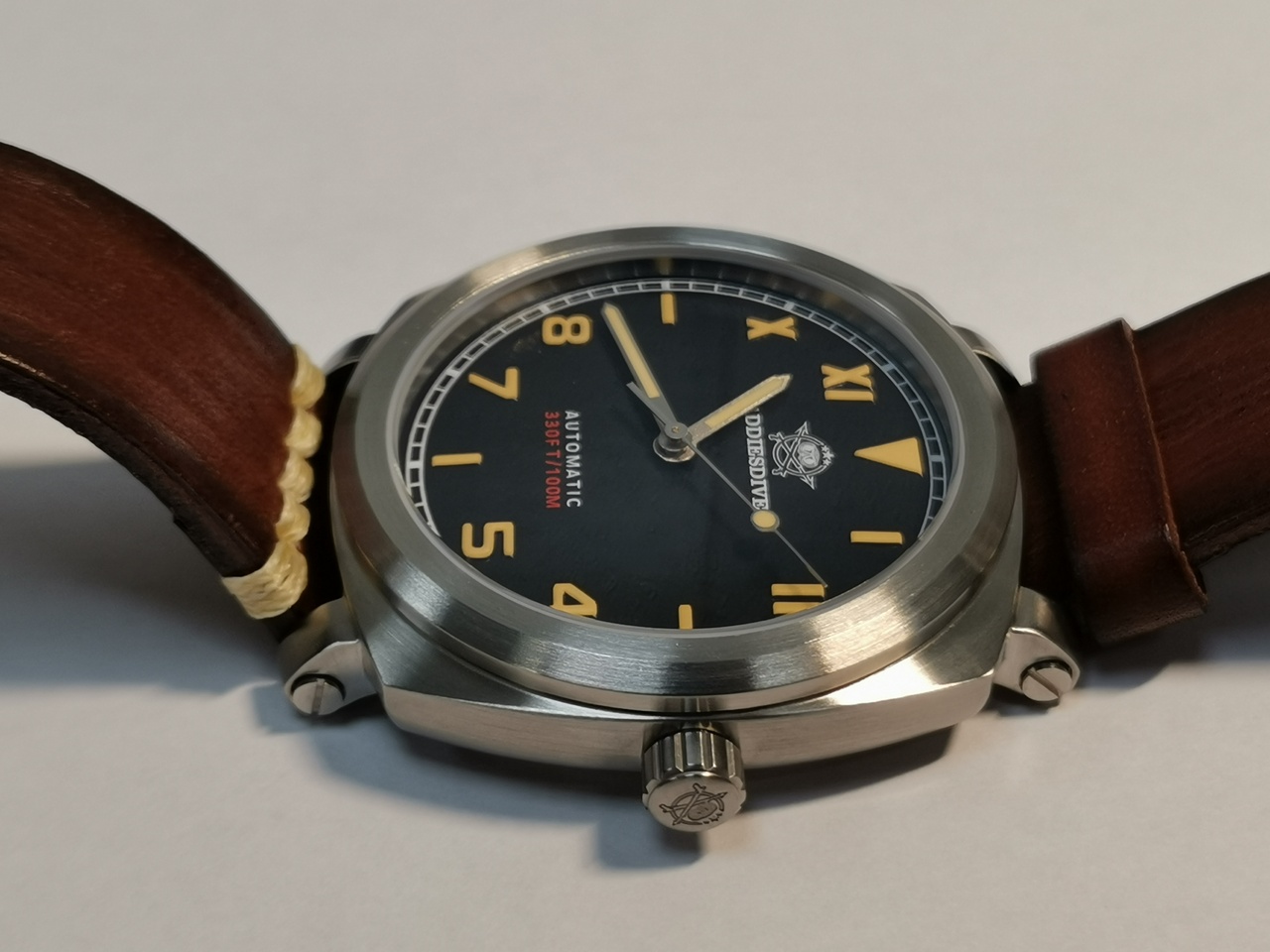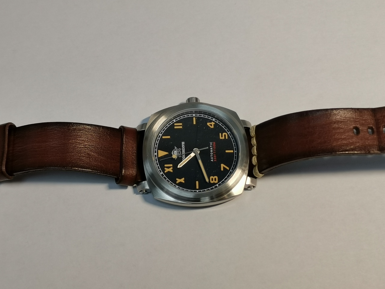 На эти часы, я обратил внимание, как на доступную «альтернативу» Спиннакера (на который слишком пристально поглядывал), да и модель у этого бренда достаточно новая. Памообразный корпус очень привлекательно выглядел на фотографиях магазина. Циферблат в стиле «Калифорния» смотрелся очень винтажно. Не знаю, что меня дернуло, но я заказал эти часы, - и вот они у меня. На момент выбора модели, я обратил внимание, что модель с черным циферблатом выглядит более привлекательно, чем с синим. Выбор ремешка для меня оказался выбором по практическим соображениям,- я выбрал коричневый, так как в случае потери кожей части пигмента, он в той или иной мере останется пригодным к эксплуатации.