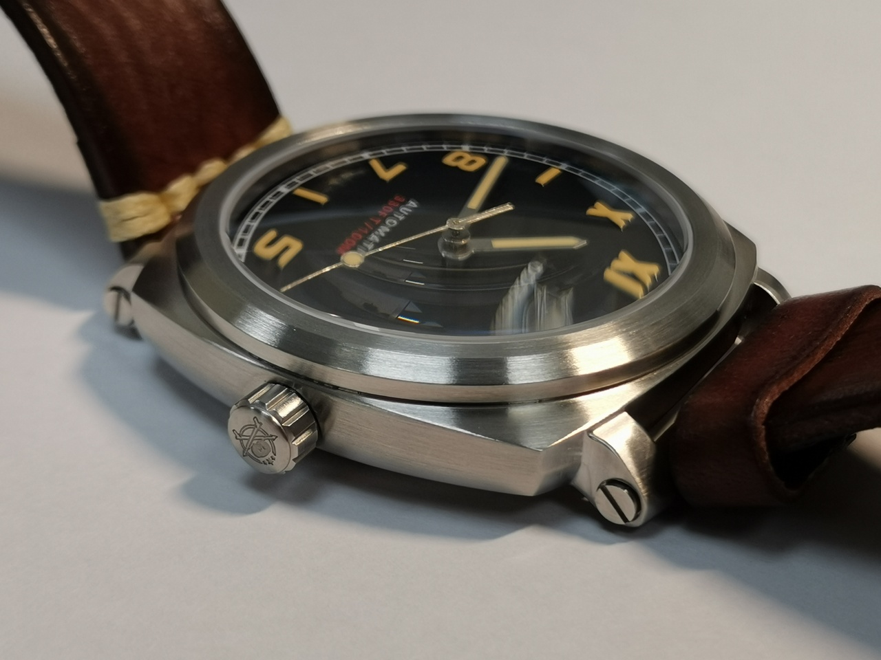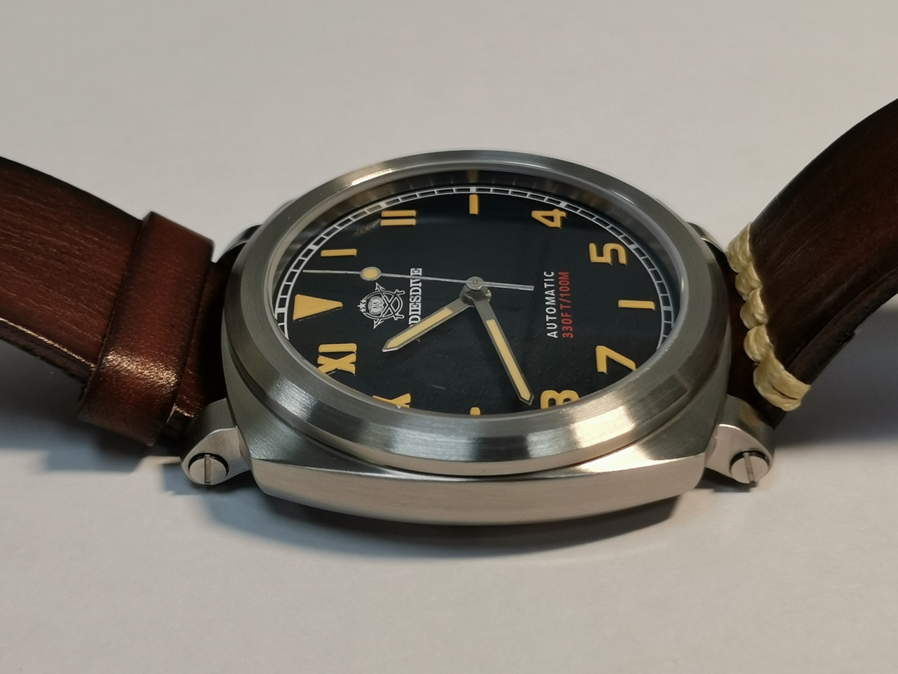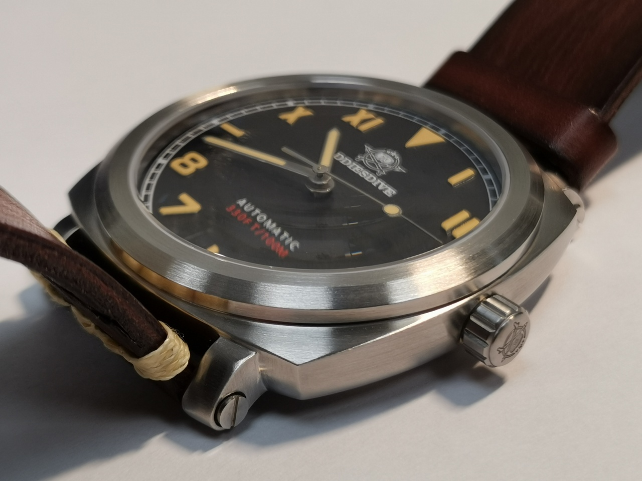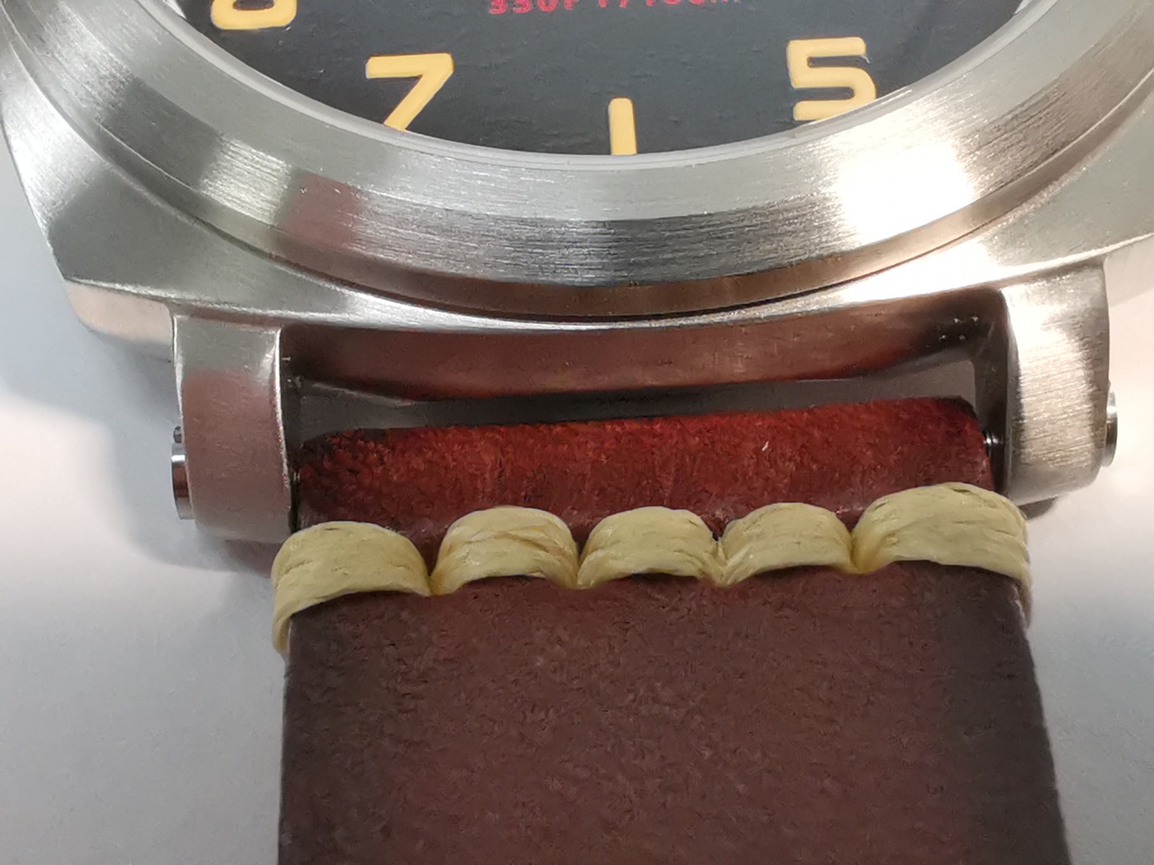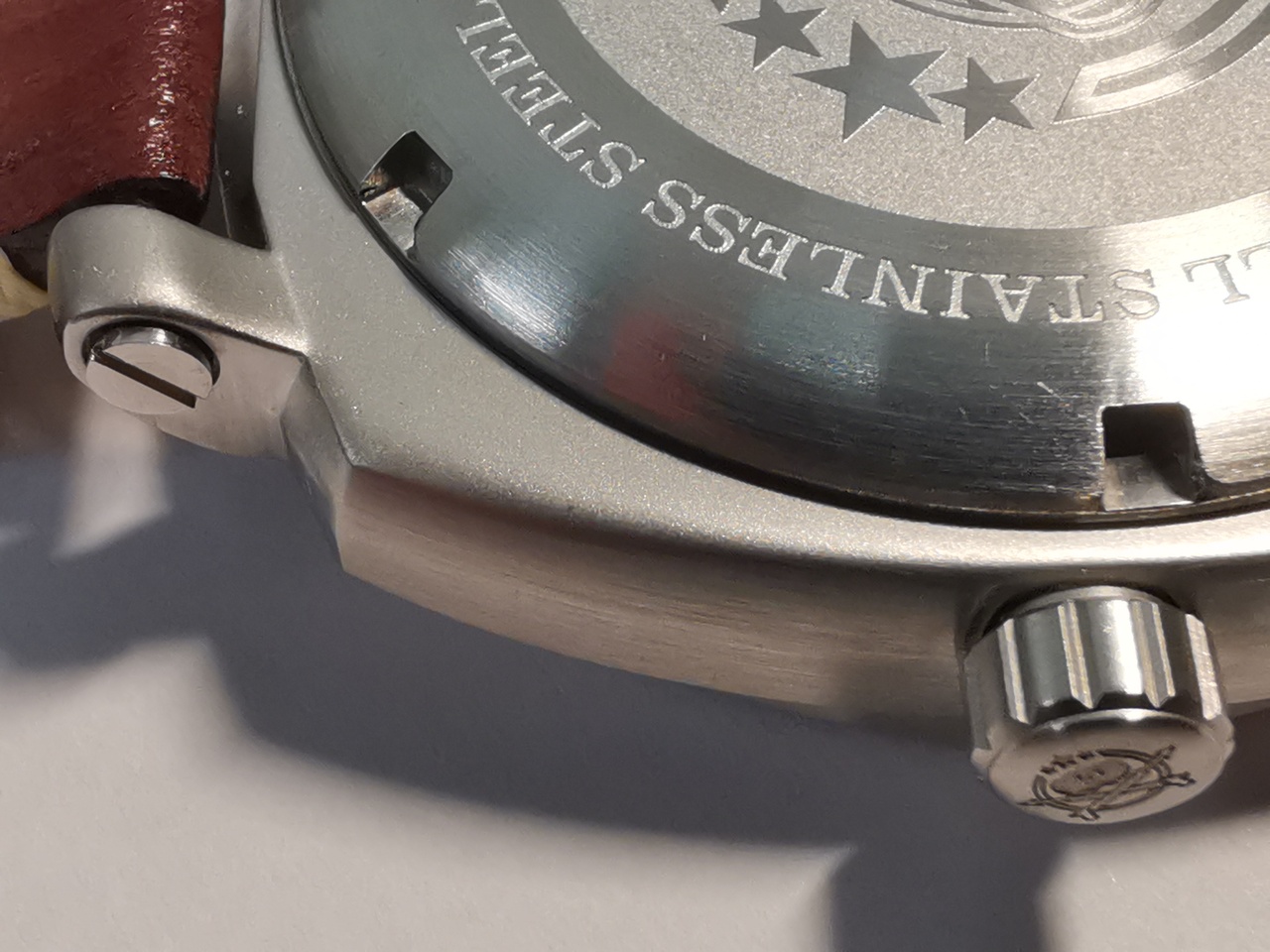 Существенный минус данного корпуса, это декоративные головки болтов, имитирующих мощную завинчивающуюся шпильку для ремешка. Я знал, что это декор, поэтому новостью для меня это не стало. Я с огорчением заметил, что эти самые головки вовсе не обработаны, и имеют острые края, - не очень приятно. Визуальный эффект от декоративных головок, сходит на нет для носящего часы, при взгляде на место крепления ремешка к корпусу. Ремешок установлен между ушек с некоторым зазором в полмиллиметра, и невооруженным взглядом видно худосочные шейки шпилек диссонирующие с мнимой мощью головок.