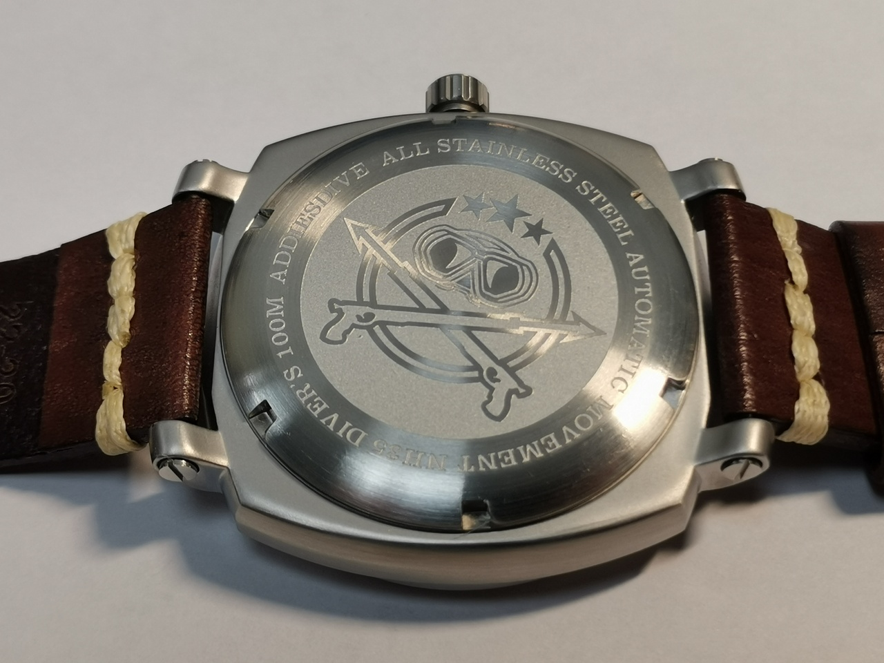 Задняя крышка часов из нержавеющей стали, выпуклая, сатинирована по периметру. На крышке по центру гравирован логотип бренда. По кругу гравирована информационная надпись - addiesdive, all stainless steel, automatic, movement nh35, divers’s 100m. Заметны явные несоответствия в виде неправильно указанного механизма и того факта, что с защитой в 10 бар, вряд ли часы можно назвать дайверскими. Общая масса часов 104 грамма.