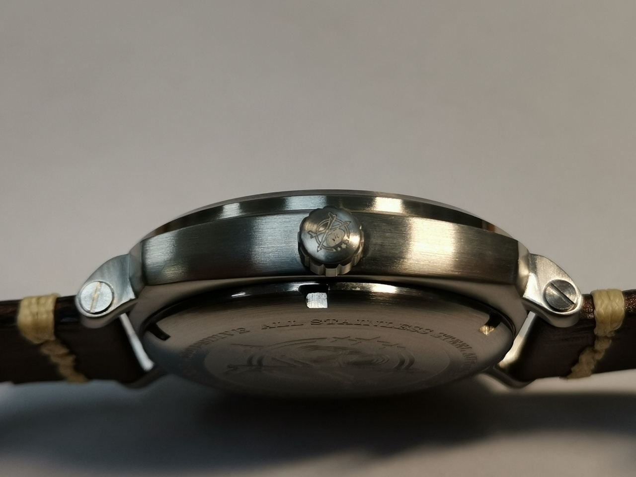Заводная головка диаметром 6мм, цилиндрическая, на резьбе. Вдоль боков цилиндра проходят клиновидные канавки для лучшей ухватистости. Верхняя сторона головки сатинирована, на ней неразборчиво гравирован логотип бренда. Головка управляет стрелками и заводом установленного механизма NH38A. Механизм работает тихо, работа ротора автоподзавода не слышна.