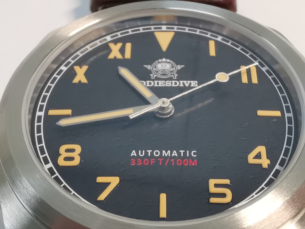 Что мне понравилось в этих часах. Не смотря на то, что при первом взгляде на часы, доставая их из контейнера, они не вызвали у меня вау эффекта, у них всё таки есть несколько приятных особенностей. А, именно: корпус имеет удобные для меня размеры – 43мм в диаметре, полукупольное сапфировое стекло с антибликовым покрытием, очень неплохой зеленый люминофорный состав нанесен на часовые метки. Заводная головка некрупная, в запястье не врезается. Надписи краской на циферблате выполнены достаточно аккуратно. Обработка корпуса в целом на троечку, но кое где, особенно сверху сделана достаточно прилично. В часах установленный механизм NH38А, работает ровно, без критических отклонений. На этом положительные моменты заканчиваются.
