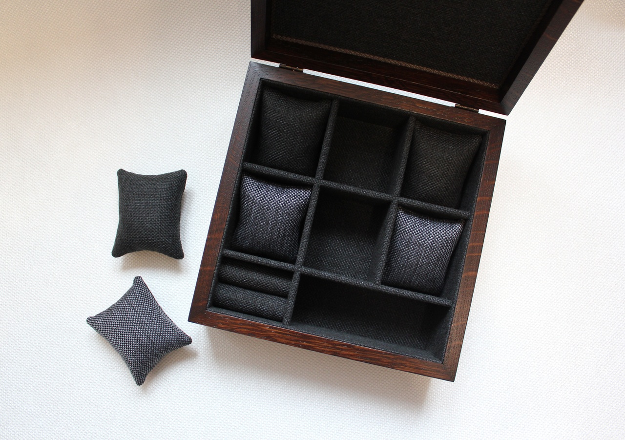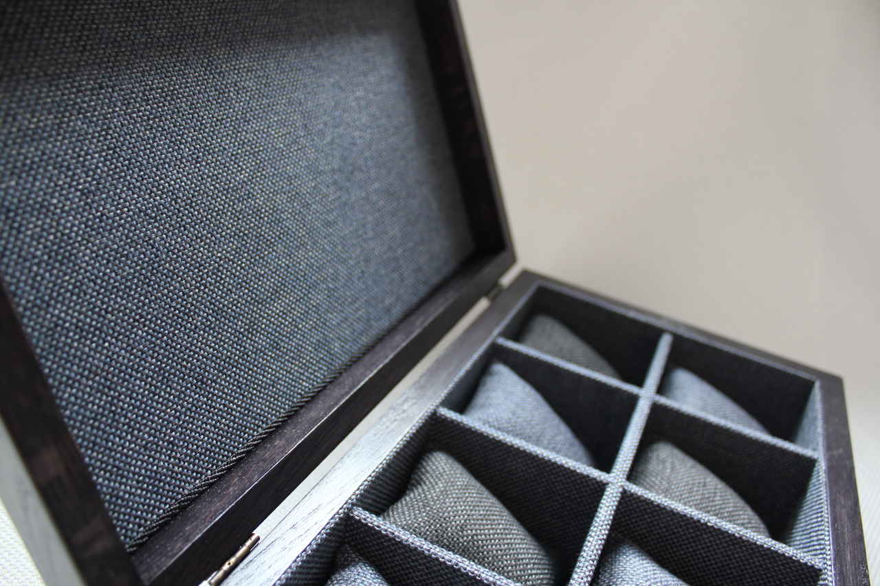 Внутри отделаны износостойкой тканью, в каждую ячейку вложена подушечка для бережного хранения Ваших часов. Снаружи покрыты лаком и гладко отшлифованы. Подчеркнута текстура и рисунок дерева. Установлены петли с ограничением угла открывания 90 градусов.