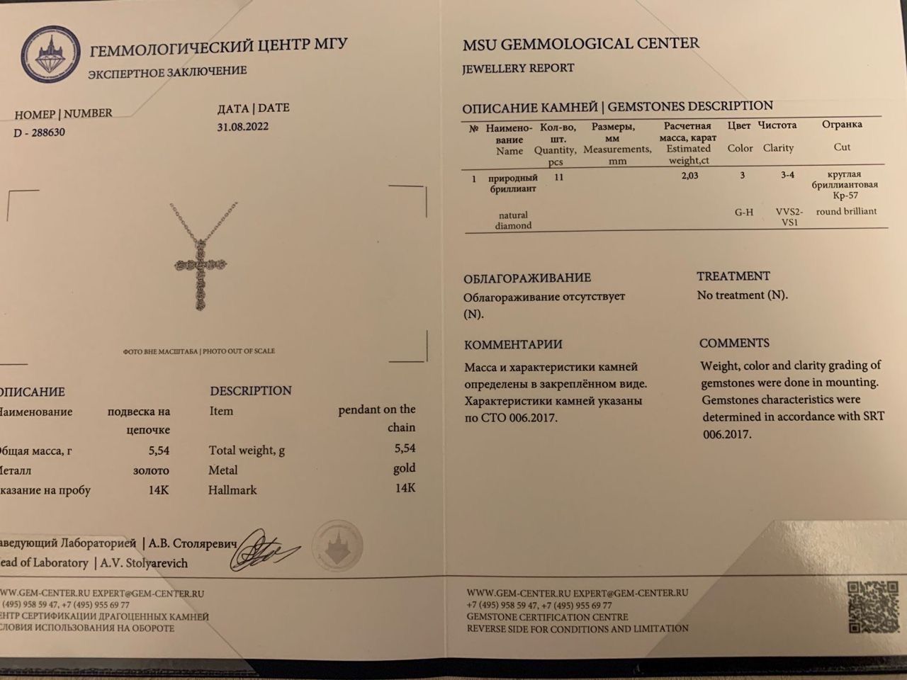 Подвеска крест белое золото с бриллиантами 2.03ct новая (сертификат МГУ) недорого
