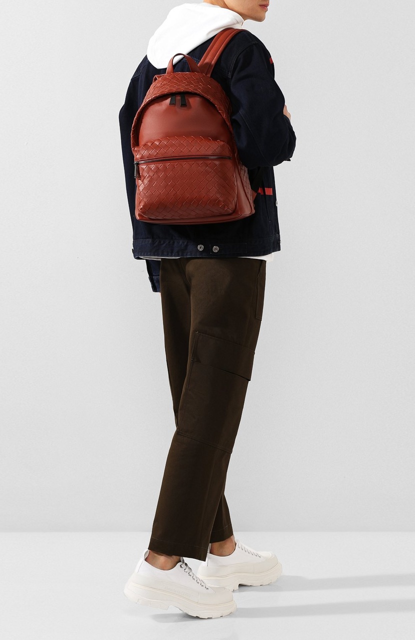"Эффектный рюкзак Bottega Veneta - в одинаковой степени практичный и модный аксессуар. В дизайне этой коллекции креативный директор Bottega Veneta Дэниел Ли по-своему интерпретирует знаковое для вещей бренда плетение intrecciato. Для создания модели Дэниел Ли выбрал прочную гладкую кожу с легким матовым блеском, а боковые панели и объемный внешний карман мастера марки выполнили в знаковой для бренда технике плетения intreccio ad inserto. В Bottega Veneta уважают художественные ремесла, поэтому все подобные операции выполняются вручную. Чтобы получить нужный узор, сначала в полотне кожи делают прорези, а затем вплетают в них узкие ленты из мягкой матовой кожи. Такие рельефные панели особенно выигрышно смотрятся в сочетании с более гладкими элементами. Рюкзак вошел в мужскую весенне-летнюю коллекцию и представлен в палитре ярких цветов."