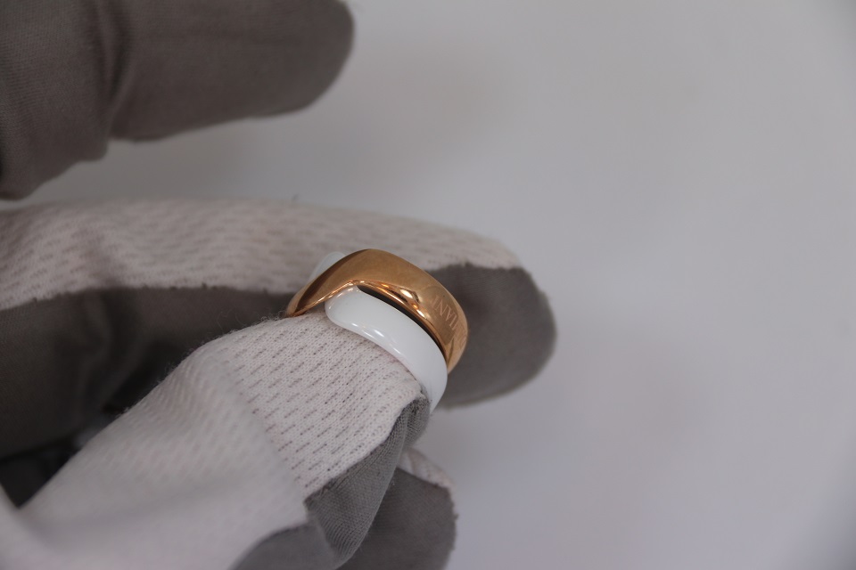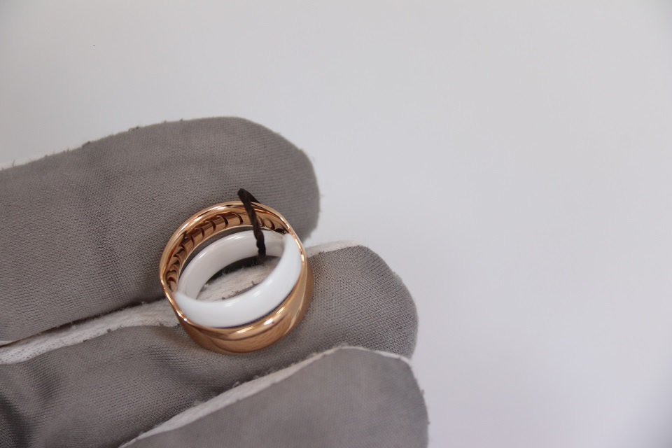 Золотая и керамическая части кольца подвижны относительно друг друга и поэтому, несмотря на большую ширину, кольцо очень удобно сидит на пальце.