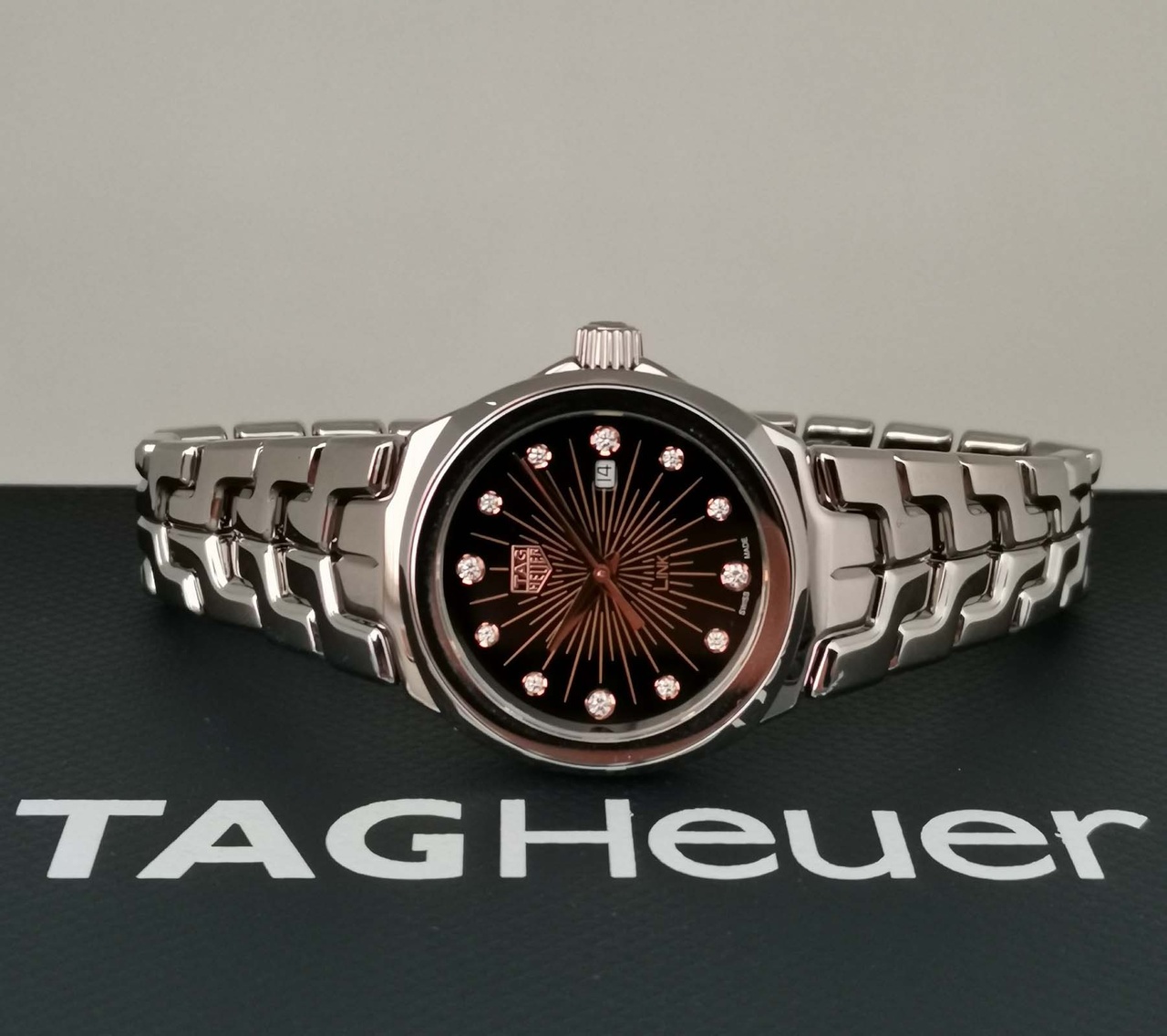 Примечание: черный циферблат с радиальным рисунком, 12 индексов с бриллиантами VS и логотип TAG HEUER, покрытый розовым золотом 5N
