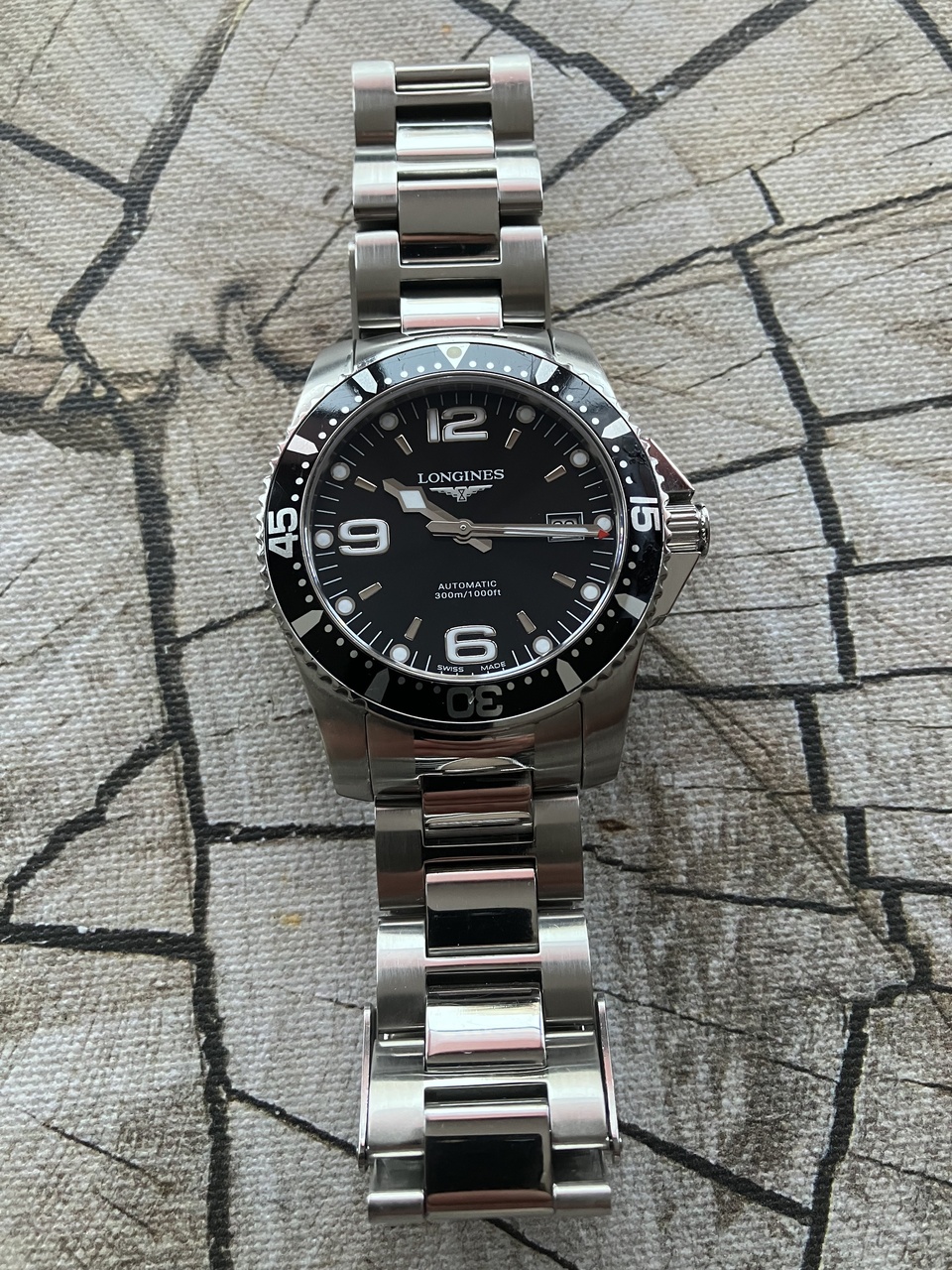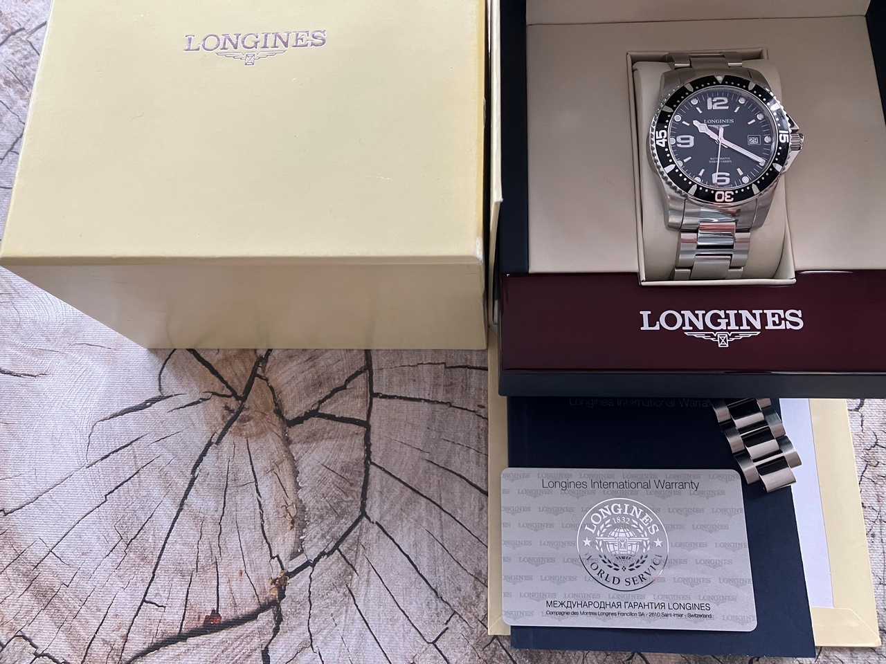 В наличии ХИТовый дайвер Longines HydroConquest L3.642.4.56.6 в хорошем состоянии. Присутствуют незначительные следы эксплуатации что разумеется учтено в цене. В комплекте: Часы, коробка, шкатулка, книжка, гарантийная карта, доп. звенья.
