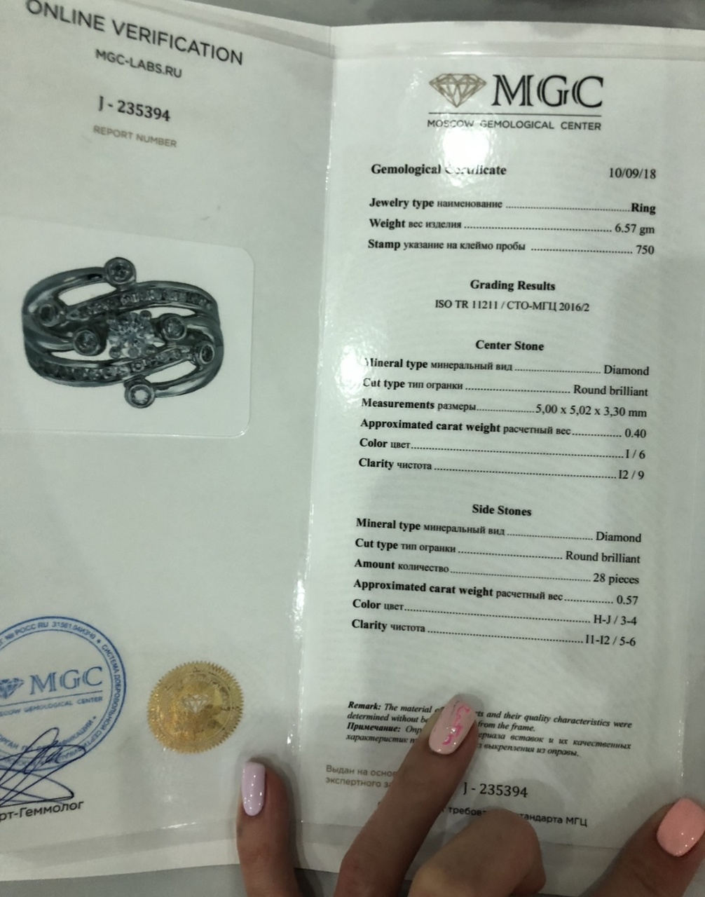 КОЛЬЦО С БРИЛЛИАНТАМИ 0,97 CT , СЕРТИФИКАТ
