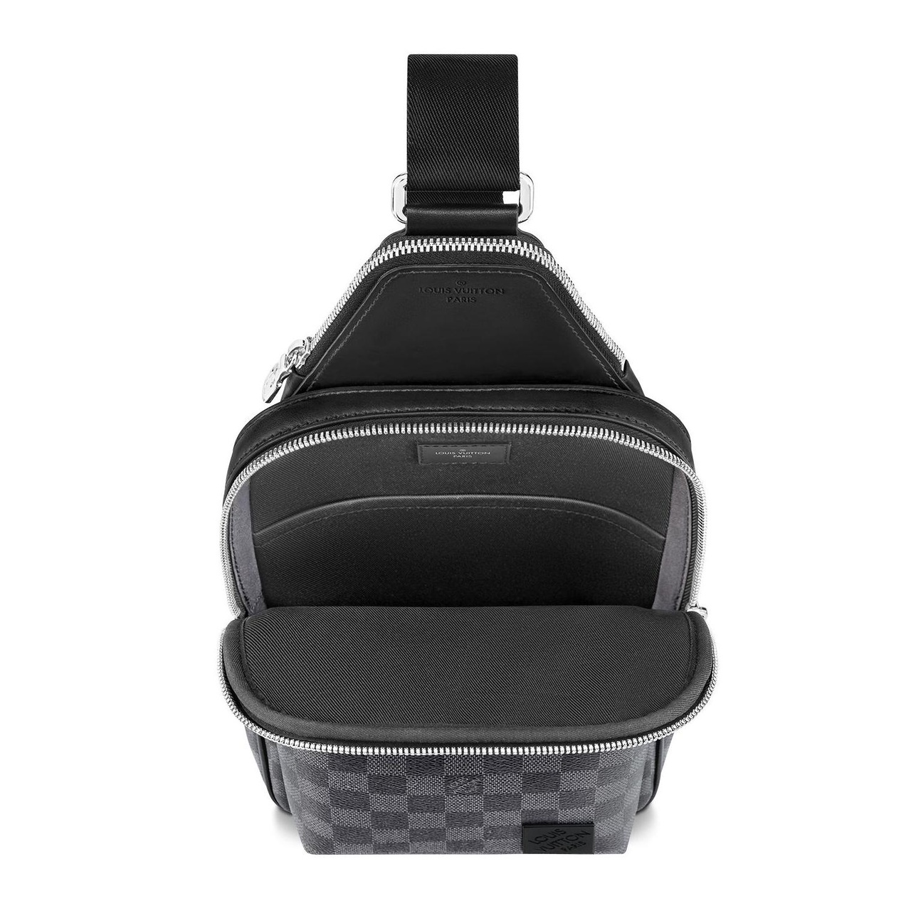 "Новую версию сумки-бестселлера Avenue Sling отличают практичные детали и современный дизайн. Модель из канвы Damier Graphite, украшенная эмблемой Louis Vuitton Paris из кожи, дополнена подкладкой и плечевым ремнём из экологичного текстиля. Отделка из кожи чёрного цвета придаёт образу элегантности. Функциональный аксессуар предусматривает удобные внешние карманы на молнии."