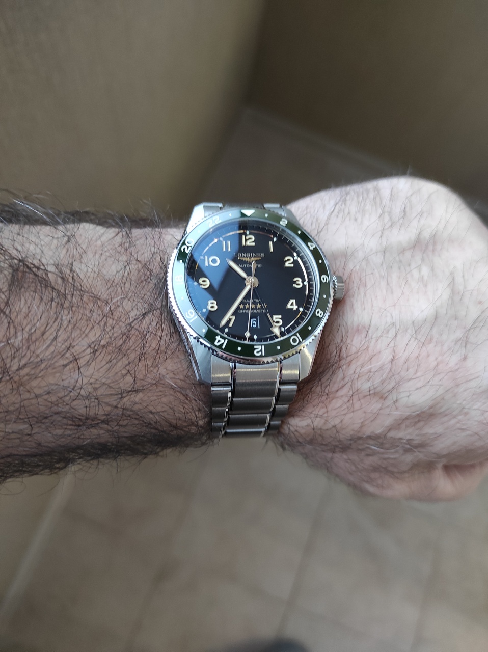 Размер на мужскую руку 42 мм, толщина 13,9 мм, сапфир с антибликом, керамический безель, калибр L844.4 с сертификатом COSC и запасом хода 72 часа, стрелки и те золотые.