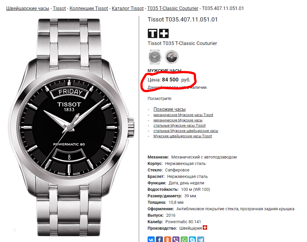 Калибр: Powermatic 80.141 (Запас хода - 80 часов)