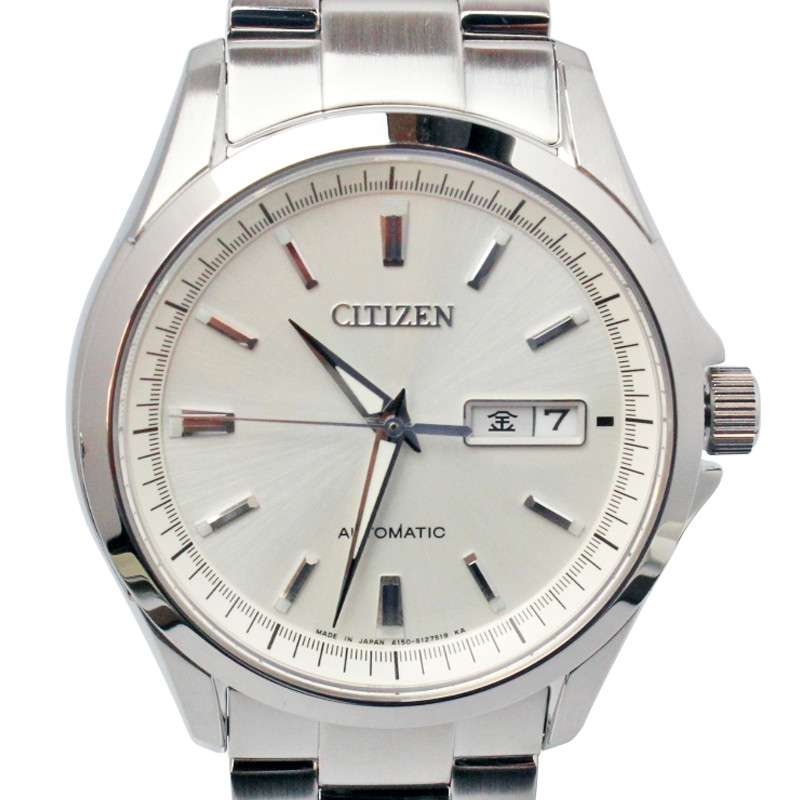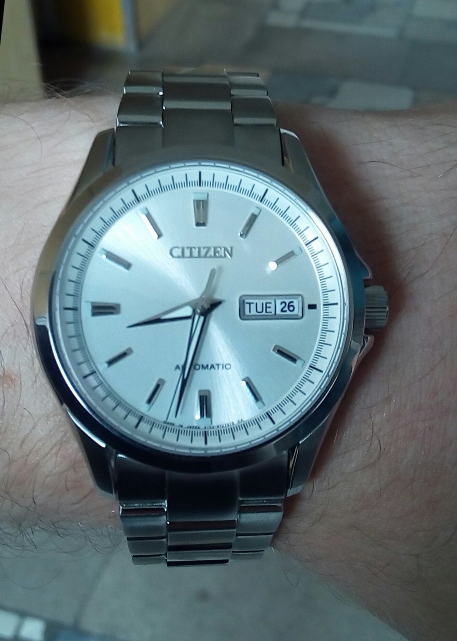 Циферблат белого цвета. Нечто среднее между молочным цветом и металлическим блеском, может даже немного перламутр, в зависимости от освещения. По циферблату как бы идут лучи сходящиеся в его центре. Метки накладные. Проградуирован в спортивном стиле ― 1/5 секунды. Никаких лишних надписей. Только накладная CITIZEN и написанная AUTOMATIC . Мелким шрифтом гордая надпись MADE IN JAPAN и номер. Окошка дня недели и даты с окантовкой. День недели на английском и на японском. Стрелки острые с люминофором.