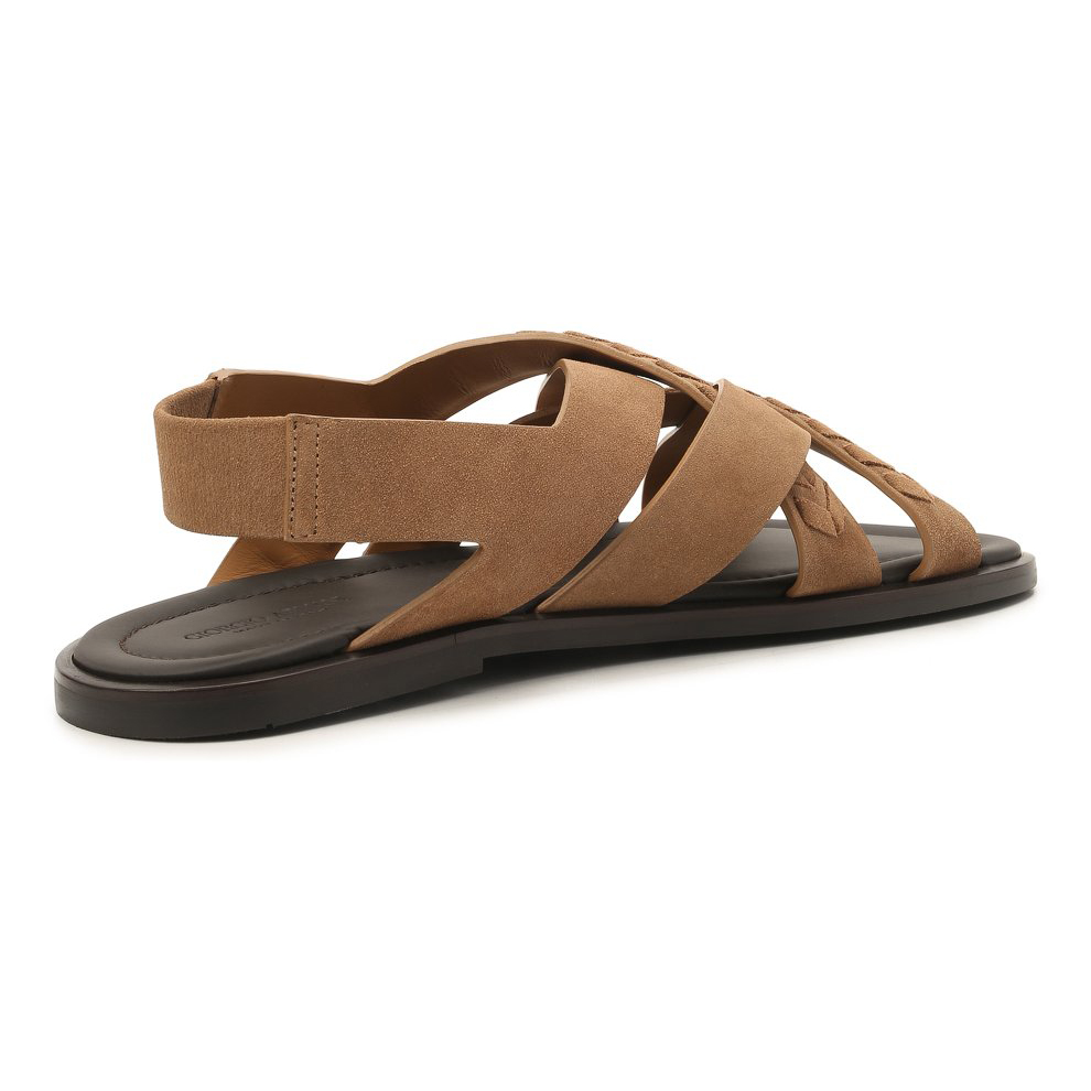 "Светло-коричневые сандалии с гибкой подошвой и ремешком с эластичной резинкой будут незаменимы в жаркую погоду. Легкая обувь, для создания которой дизайнеры Джорджио Армани выбрали широкие ленты бархатистой мягкой замши, украшена шевронным узором."