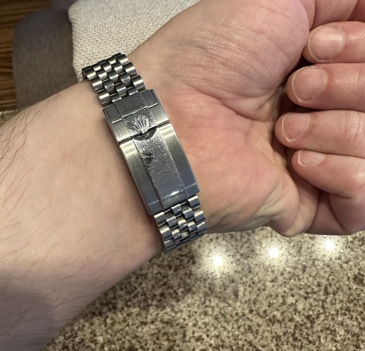 Часы имеют следы носки, но без серьезных недочетов. В основном царапки на застежке. Сколов, глубоких царапин, забоев и пр. нет. Полировка приведет часы в состояние если не новых, то близко к этому. Состояние скорее ААА, но, учитывая, что часы при проверке вскрывались, ставлю АА.