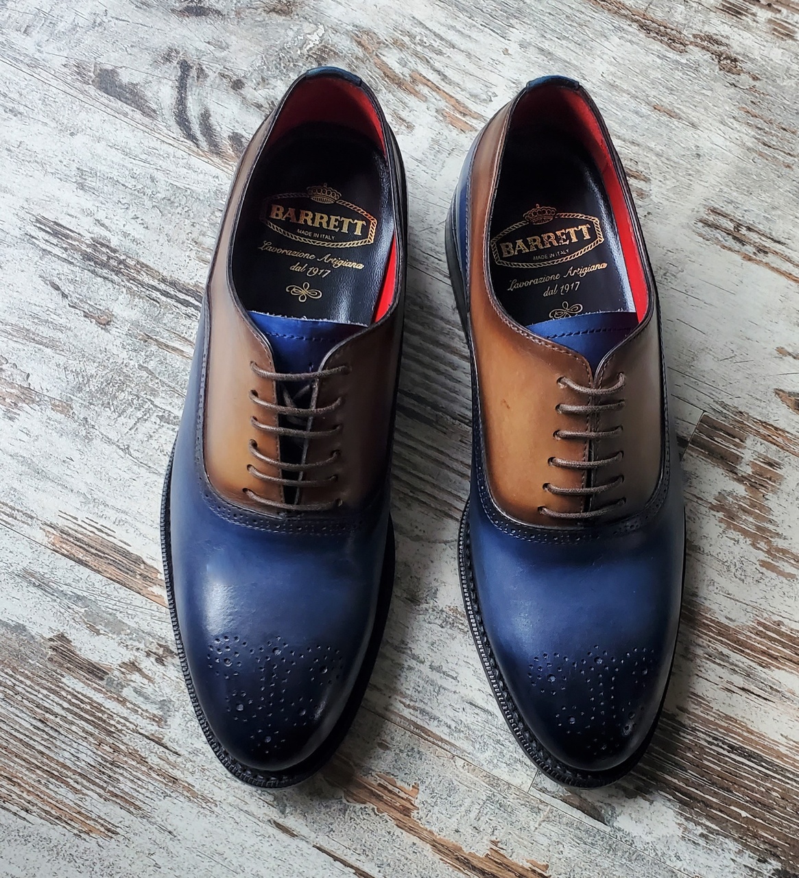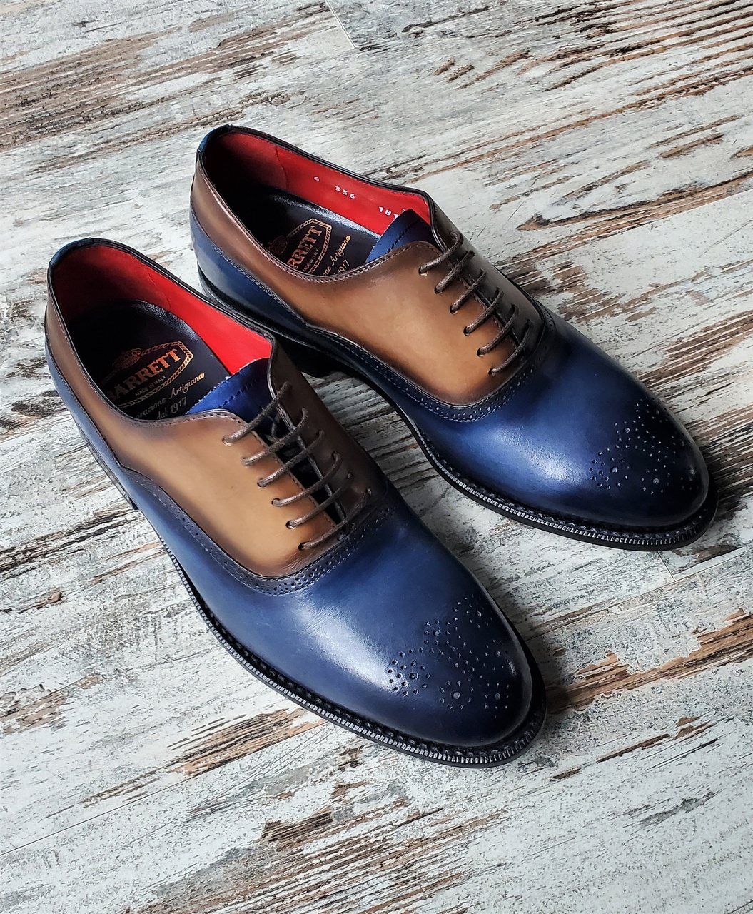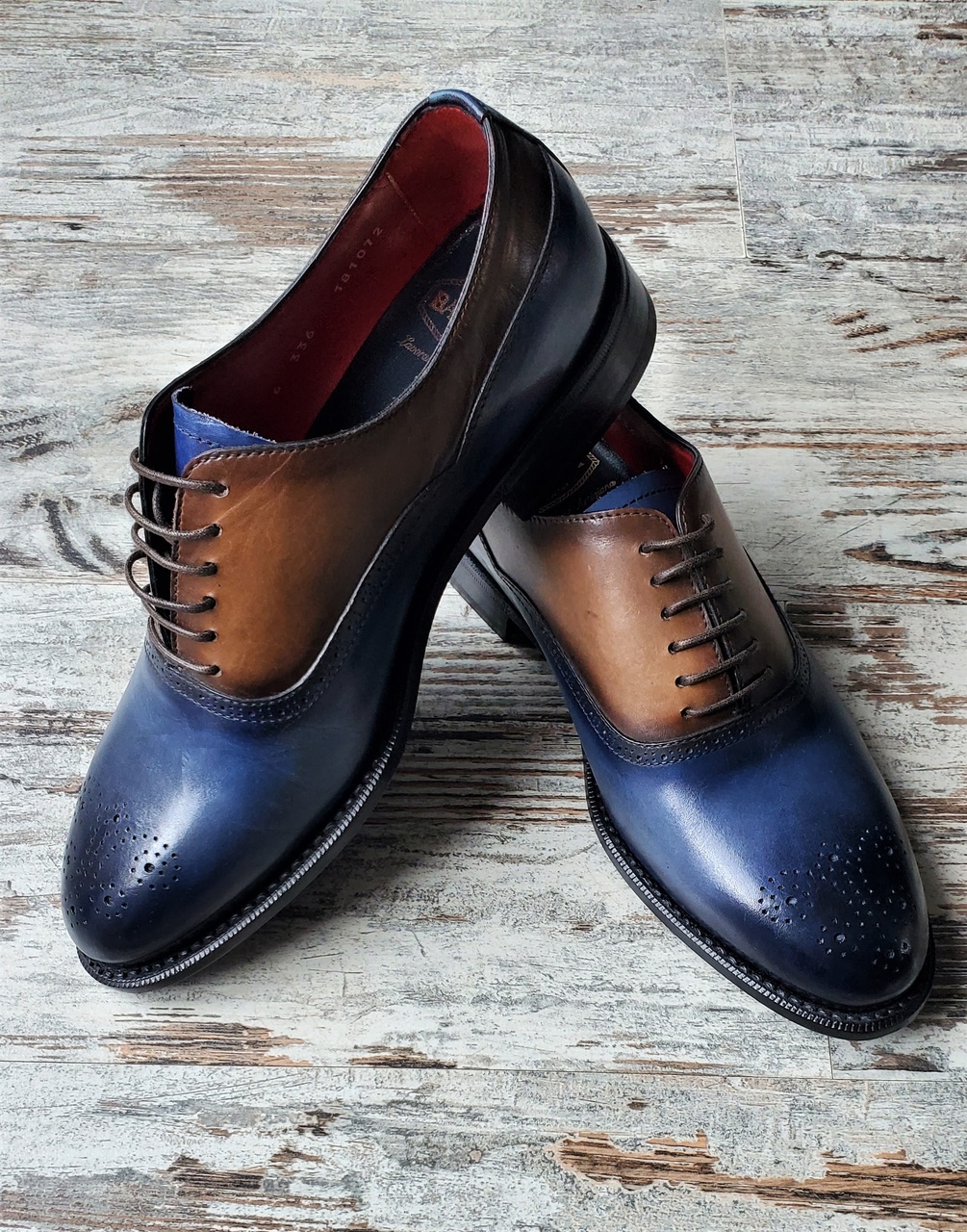 Изготовлены из 100% телячьей кожи высочайшего качества выделки, окрашенной полностью вручную в комбинированный синий и коричневый цвет с эффектом патинирования «антик».