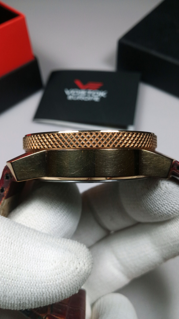 Мощный стальной корпус с покрытием PVD-RG (Позолото) заводная головка завинчивается, для полной герметичности часов. Задняя крышка стальная с прозрачным стеклом. Есть жизненные, не значительные потертости. Убираются полировкой корпуса.
