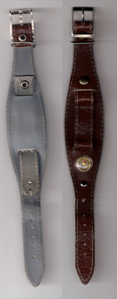 Вот что меня давно занимает. Как появилась такая мода? Рассматривая старые часы на многих зарубежных сайтах, я не видел ничего подобного. Нет, конечно, встречаются военные, туристические ремешки со встроенным компасом, были такие и в СССР. Один такой, отечественный, есть на моей фотографии. Но чтобы с чьим-то лицом, да ещё в промышленных масштабах… Вот мне кажется, изначально, ремни эти задумывались под компас. Кому-то пришло в голову, вместо компаса, может в силу его поломки, может от нерастраченного дизайнерского потенциала, вставить фотографию… ну, подружки, скорее всего. Веяние прижилось, а артельщики, клепавшие ремни, просекли фишку, и при недостатке компасов (фотографий-то напечатать проще) поставили на поток. А кого, в 60-х годах, если не Гагарина, туда вставить? Чтобы покупали, нужно, чтобы все знали, все любили и гордились, и чтобы не посадили. Ну не Сталина-же, в конце концов!