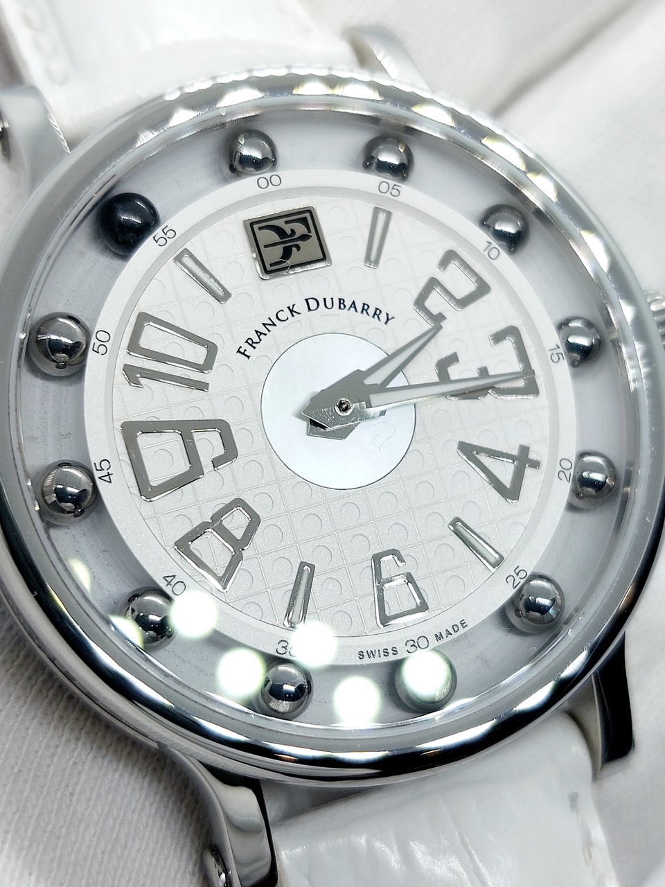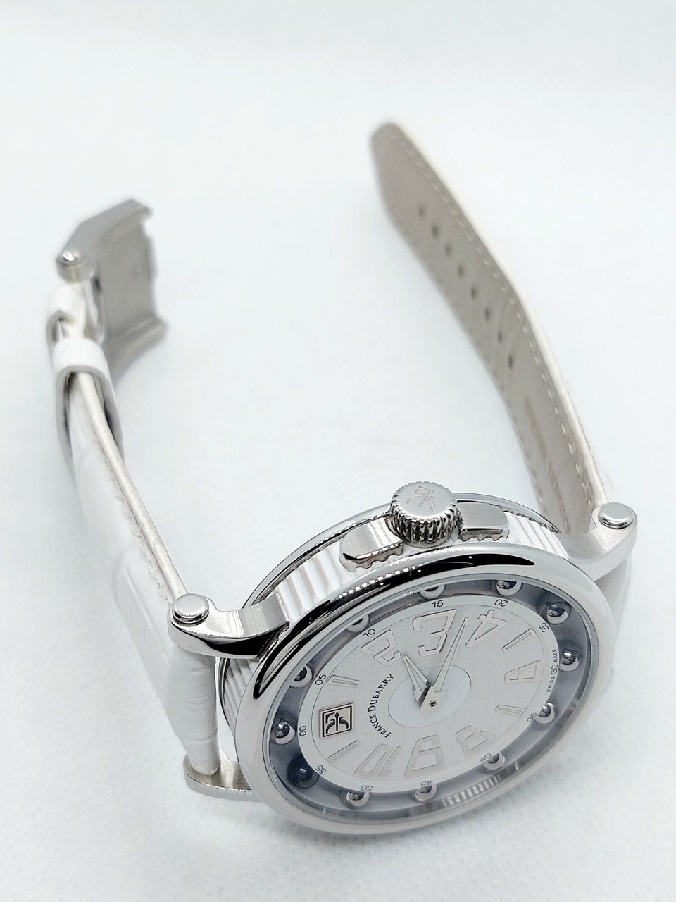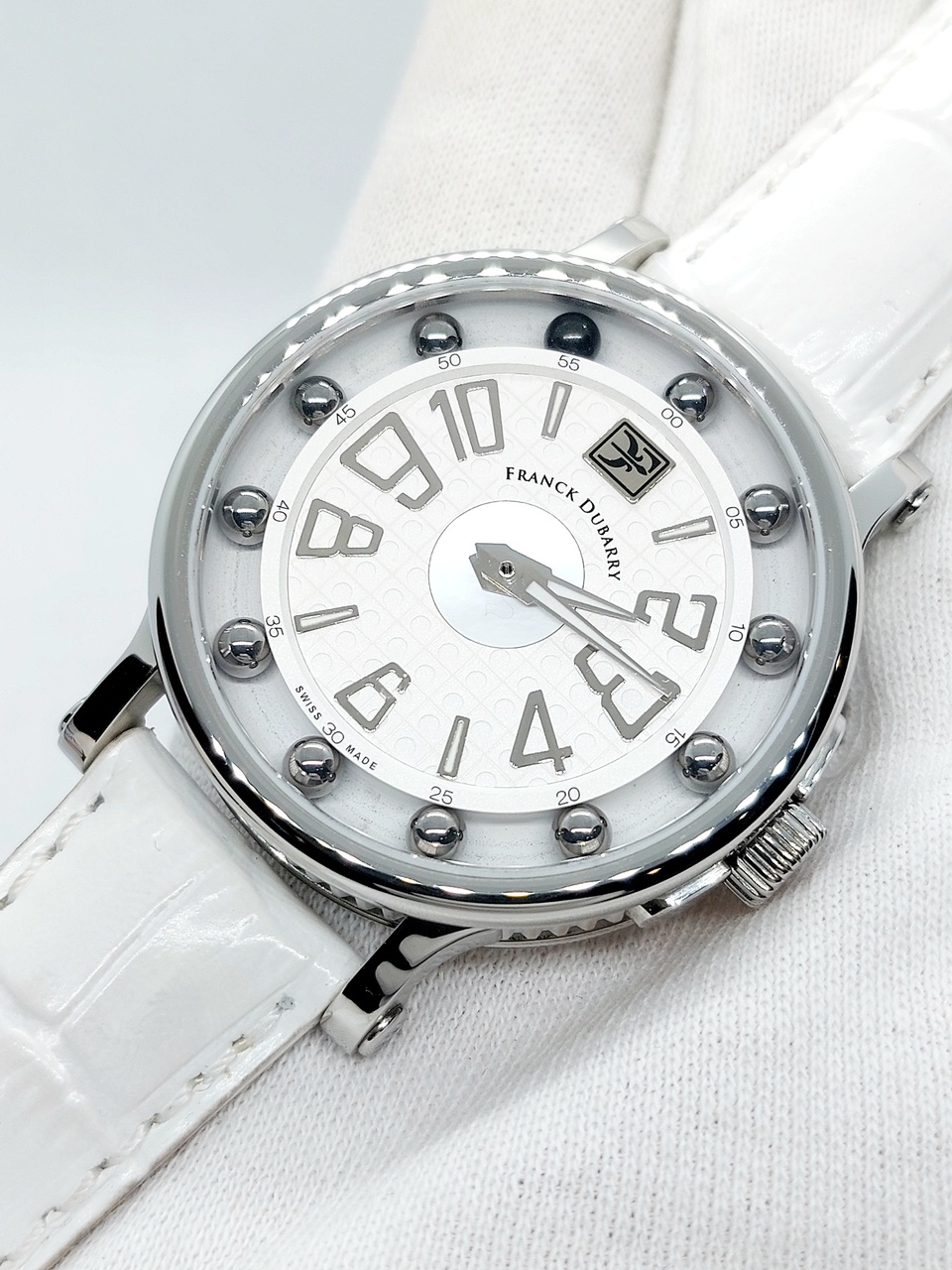 Под отметкой 12ти часов расположен шильдик с логотипом бренда, а под ним название марки Franck Dubarry.