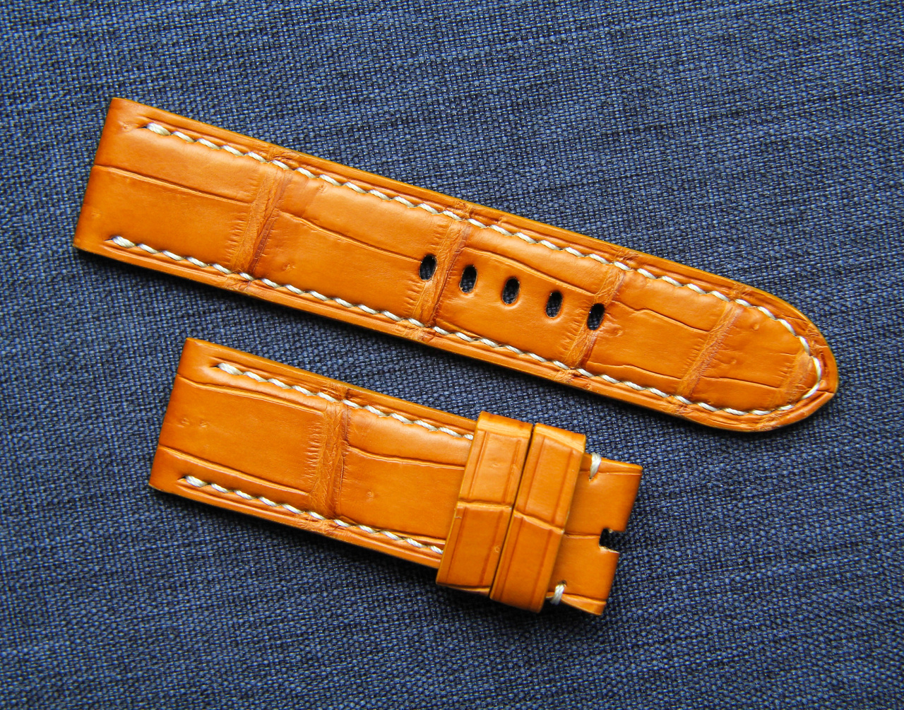 Рыжий, прямой крокодил классической выделки. Прошит белой нитью. Ширина 24/24 мм, длина 125/75 мм, толщина около 3,5-4 мм, с возвышением по центру ремня, средне мягкий. Подклад - бежевая гипоалергенная кожа козы (Falco Pellami SPA), края покрашены в цвет ремня. Выделка лицевой и подкладочной кожи Италия. Две шлевки, подвижная и вшитая. Цвет огонь, фактура бомба.