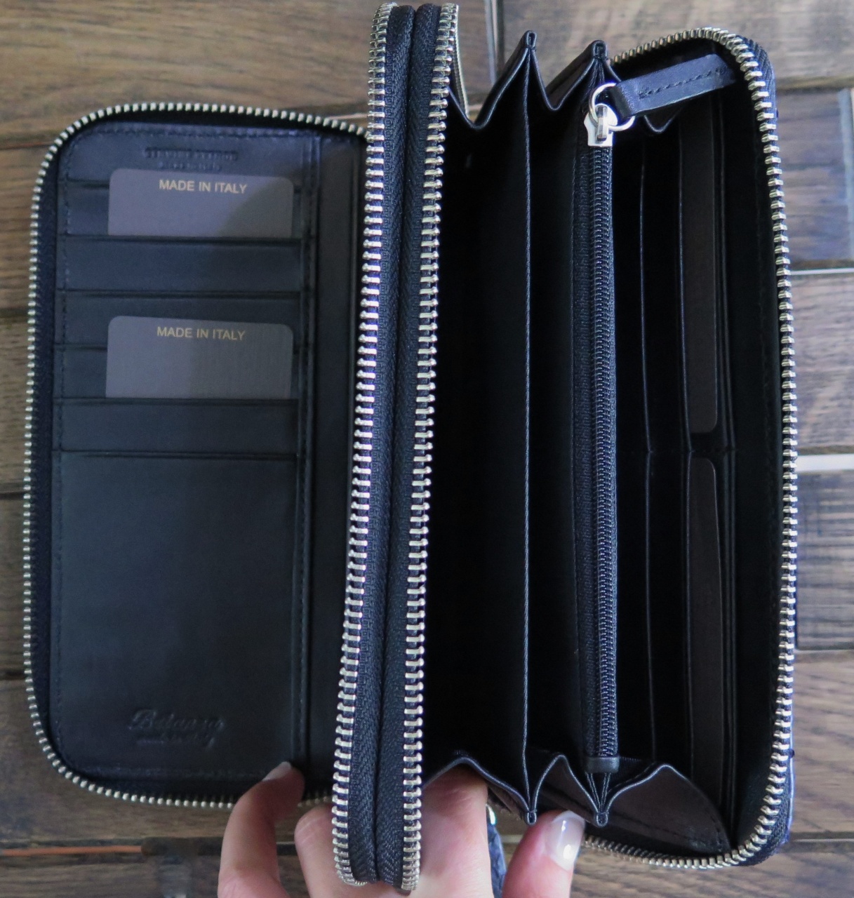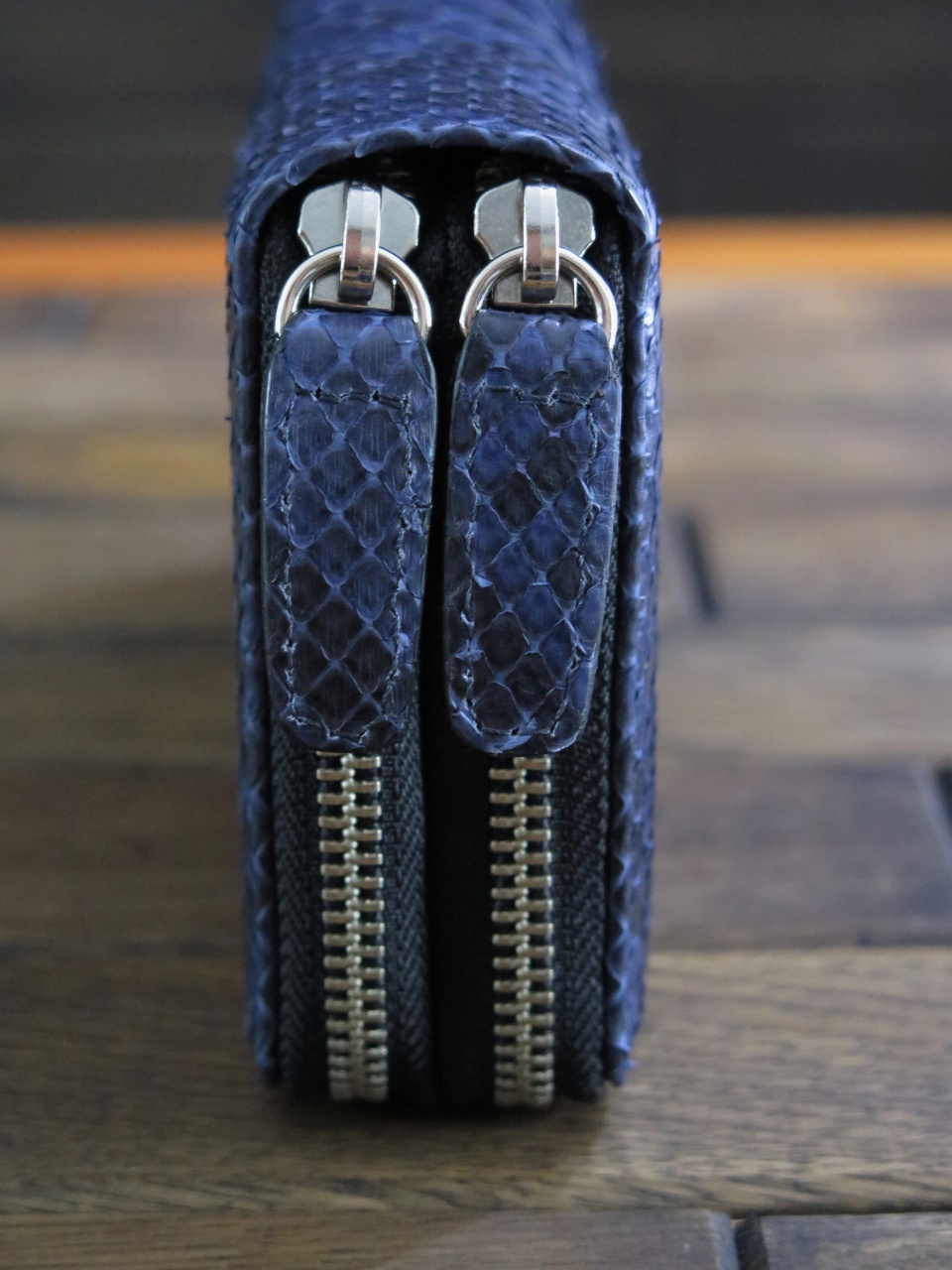 Клатч застегивается на две серебристые молнии с бегунками из кожи анаконды и имеет три больших отделений для банкнот, 24 отделения для кредитных карт или визиток, отделение под монеты, отделение для паспорта, водительских прав, и других документов.