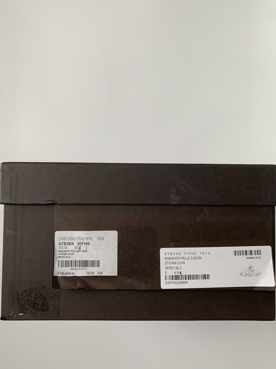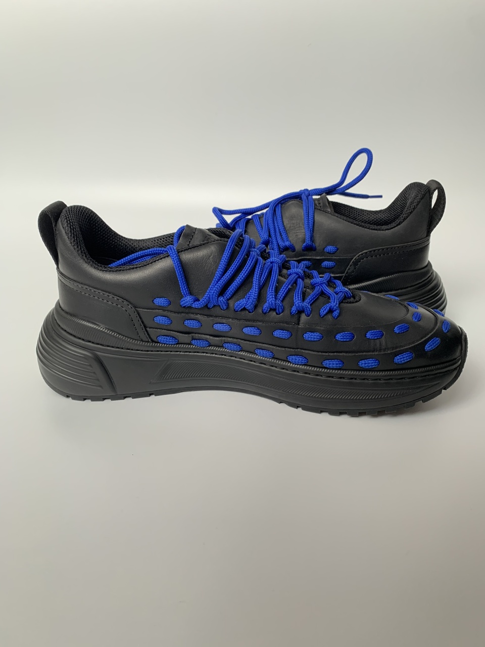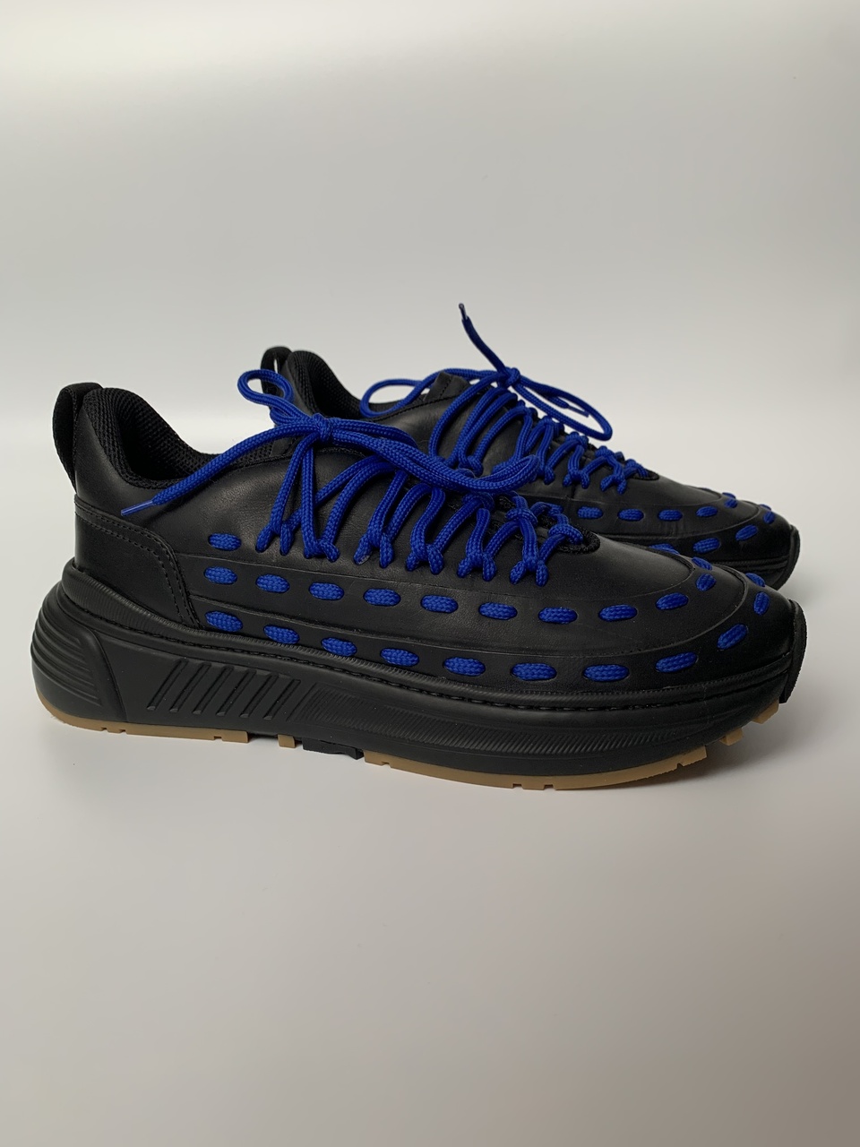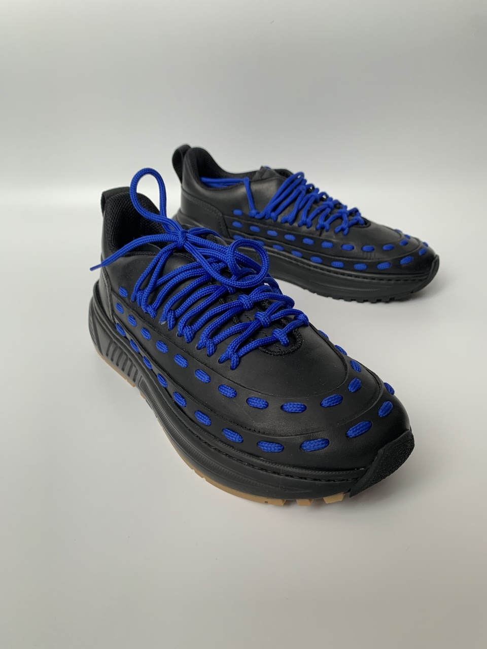 Чёрные кроссовки не выглядят просто благодаря шнуровке оттенка синий электрик и двойному стичингу ей в тон.Обувь изготовили из гладкой матовой кожи растительного дубления,поэтому она получилась особенно мягкой и эластичной.