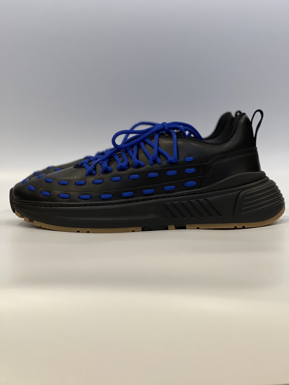 Чёрные кроссовки не выглядят просто благодаря шнуровке оттенка синий электрик и двойному стичингу ей в тон.Обувь изготовили из гладкой матовой кожи растительного дубления,поэтому она получилась особенно мягкой и эластичной.