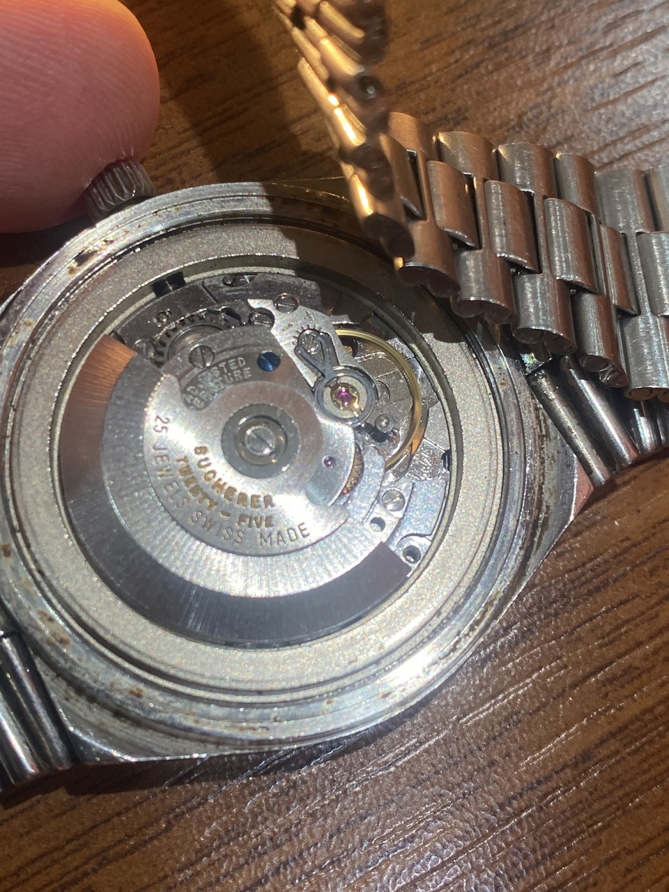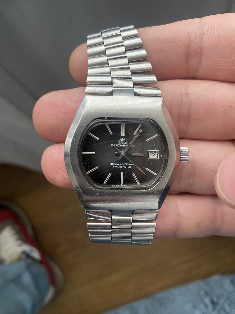 Старый bucherer ,годов начало 80х - конец 70х, хорошие часы ,не сильно "ушатанные", механизм в общем хороший. Проблемы я вижу две, убитое стекло редкой формы и не "актуальная" форма корпуса. Цена в районе $150 - 200