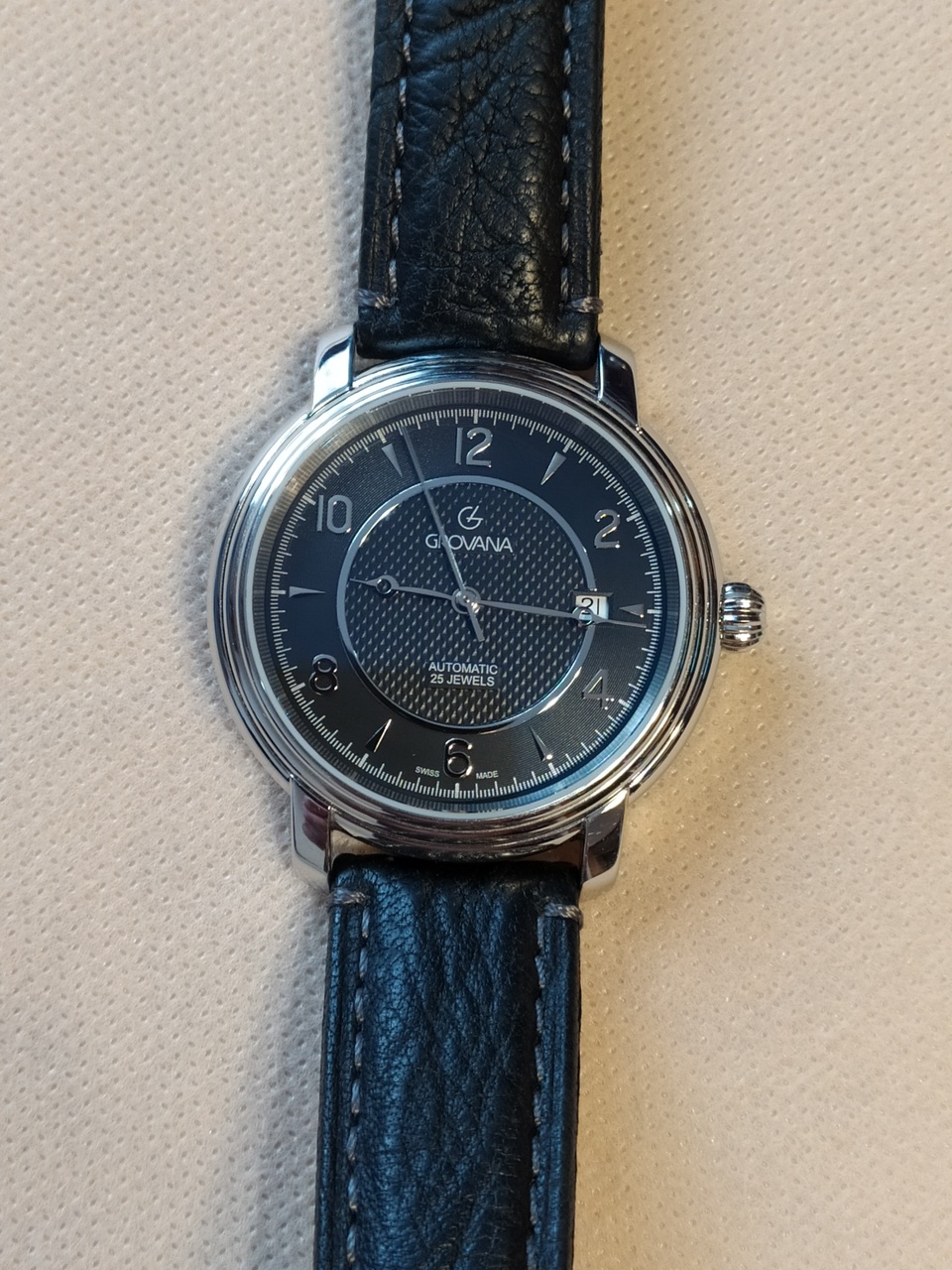 - Черный, гильошированный, накладные арабские цифры и метки, окошко даты.
