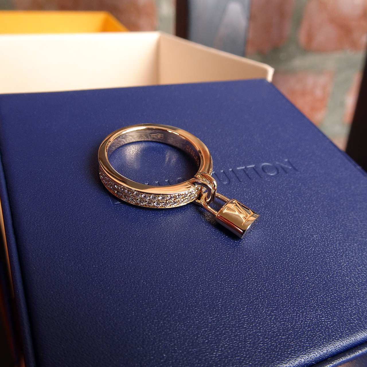 "Подобно навесным замкам, символизирующим вечную любовь, которые влюбленные во всем мире прикрепляют к мостам и другим знаменитым достопримечательностям, это великолепное кольцо Lockit от Louis Vuitton из розового золота, украшенное бриллиантами и подвижным миниатюрным замком LV, станет идеальным подарком в честь любви."