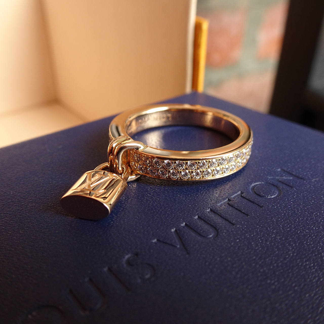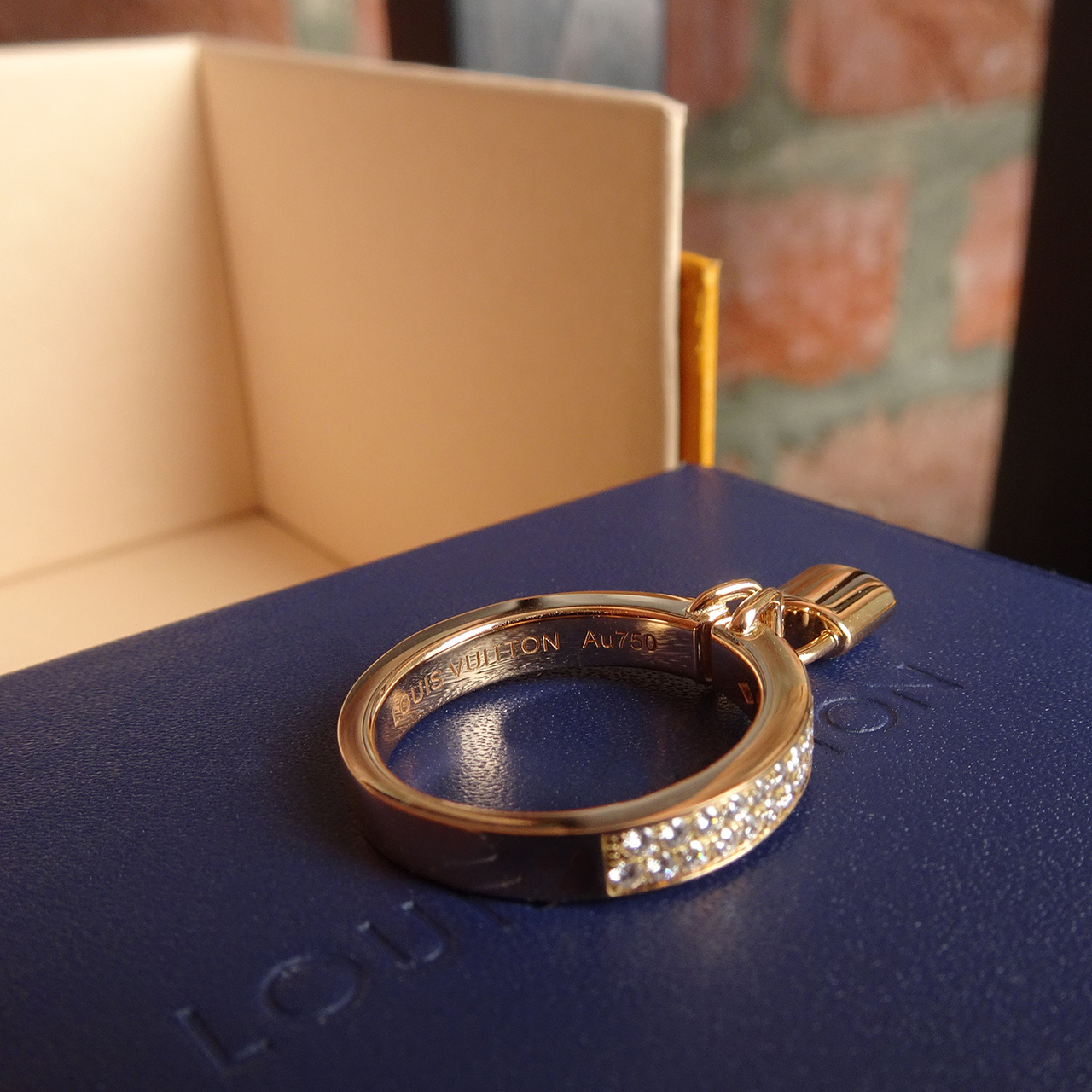 Эффектное кольцо из золота с бриллиантами, с подвижной золотой подвеской-шармом в форме знаменитого "замочка" Louis Vuitton, который в данной коллекции представлен как символ вечной любви.