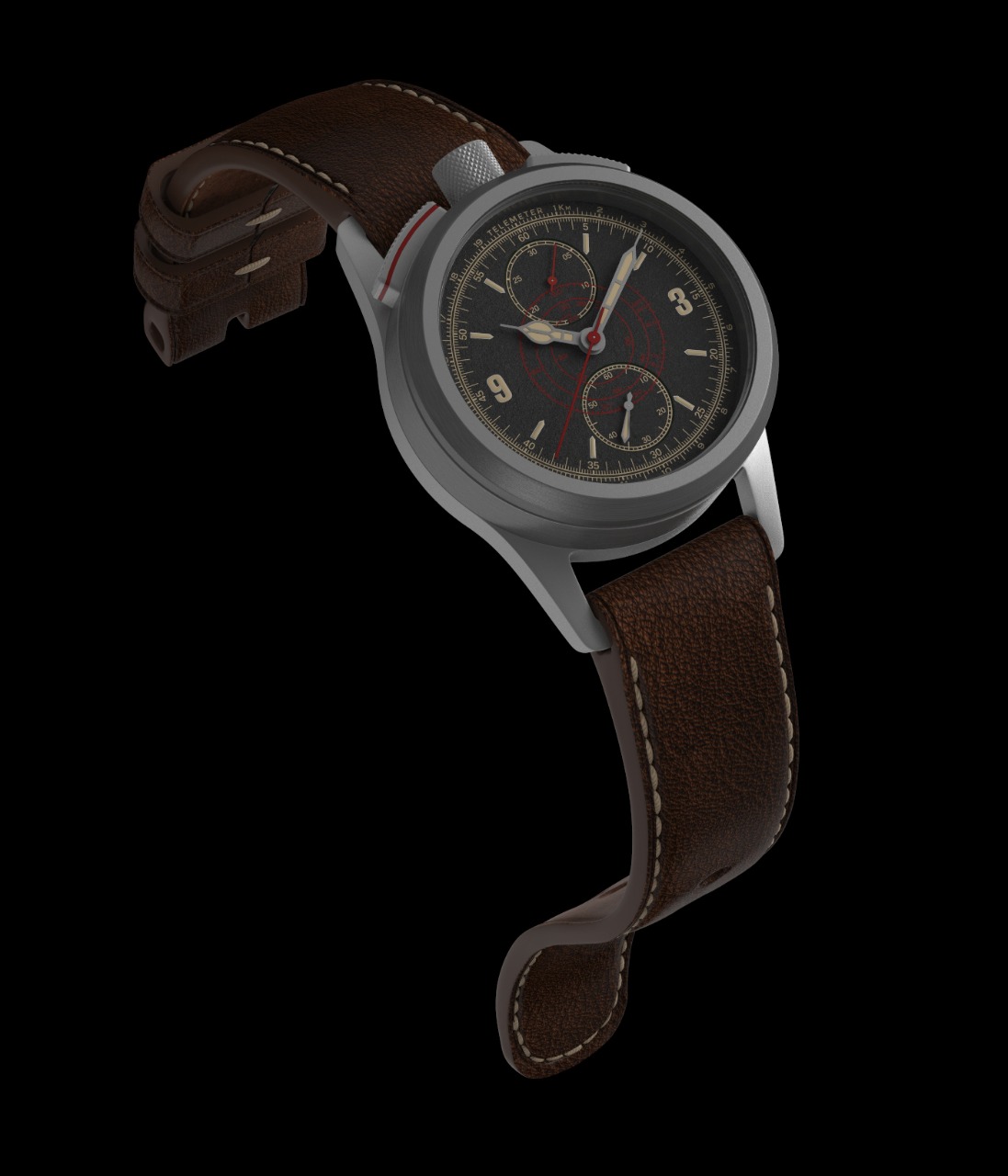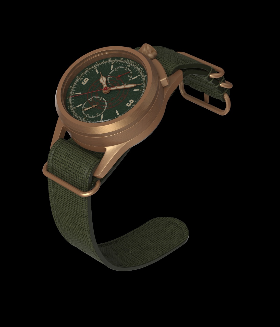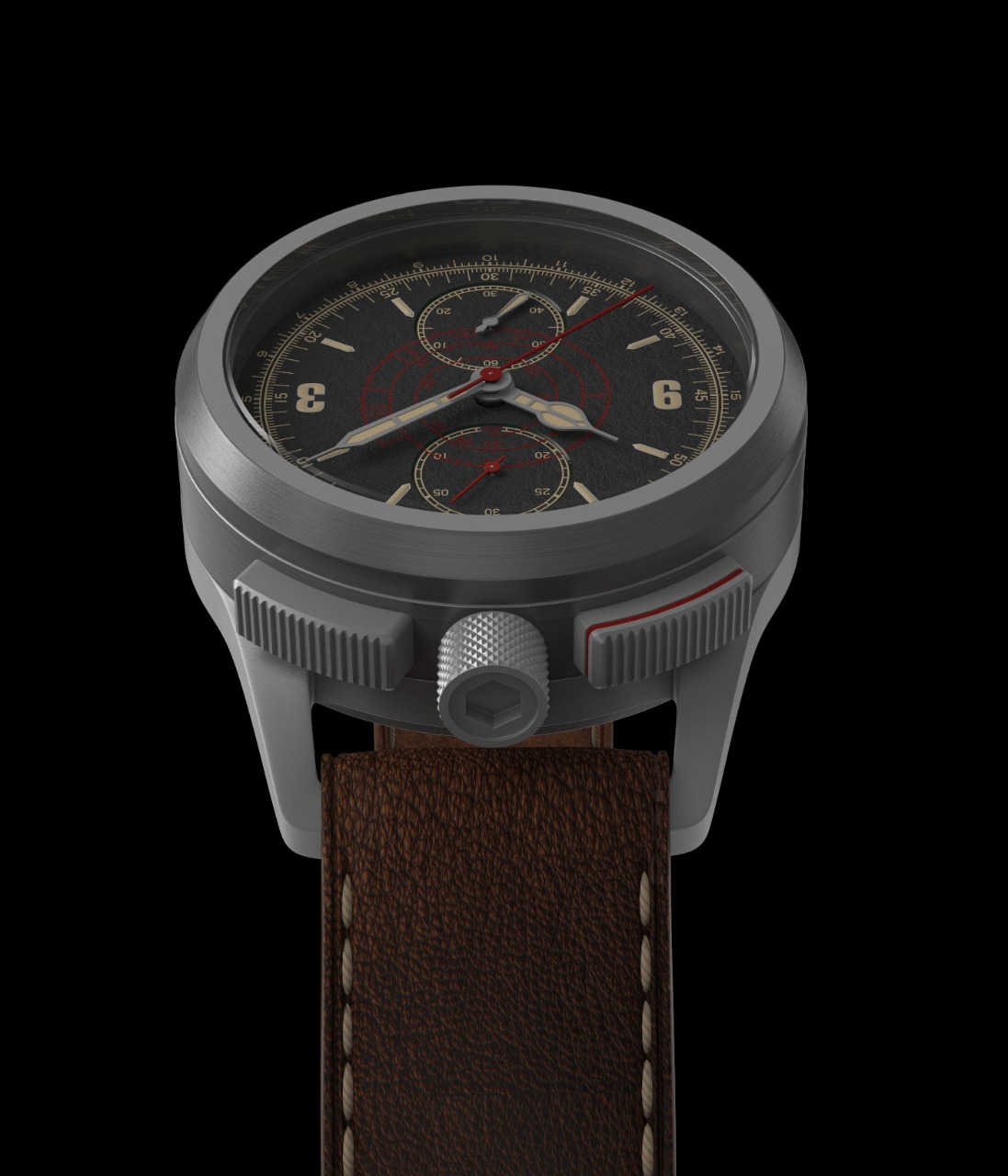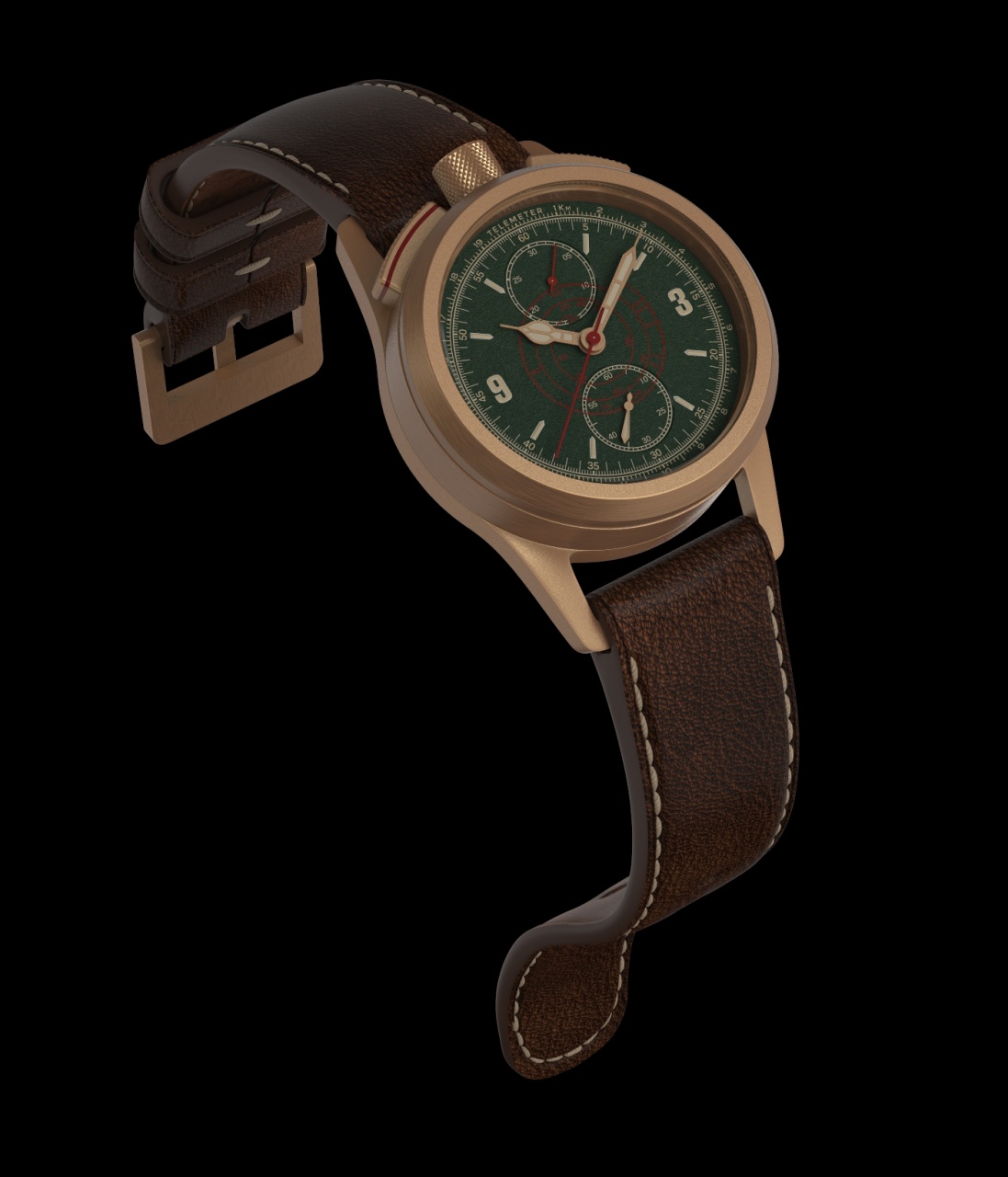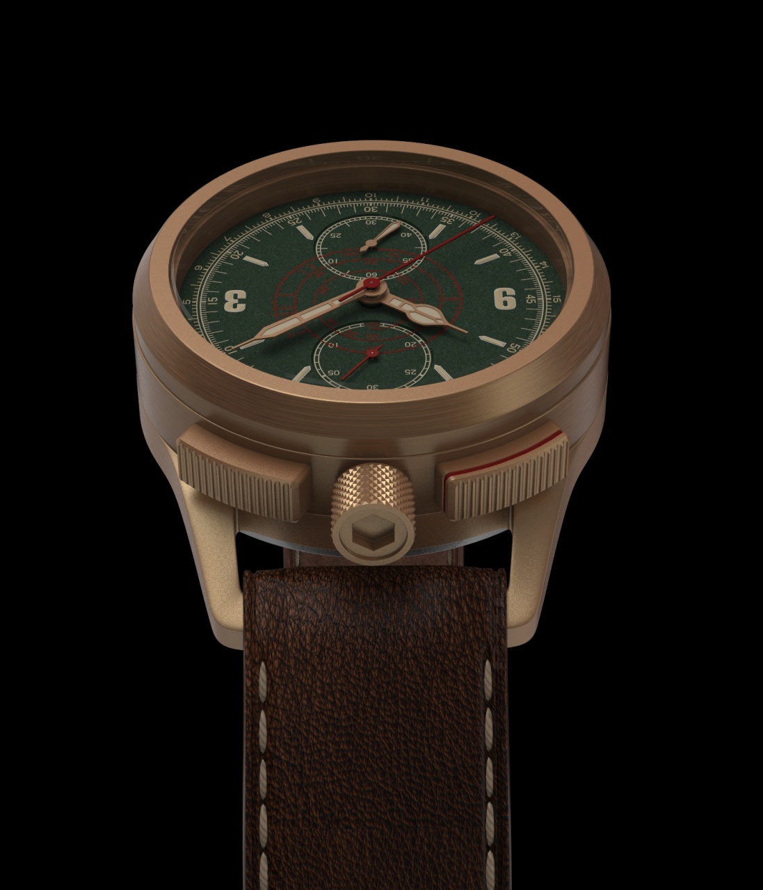Несмотря на то, что часы того времени были достаточно большого размера, мы постарались сделать часы носимыми и оптимального размера, поэтому размер часов получился 43 миллиметра. Стекло - плоский сапфир. Водозащита 100 метров. Люминисцентное покрытие swiss super luminova old radium LE. Корпус часов - бронза, задняя крышка стальная на винтах. Часы будут снабжены автоматическим хронографом от pts resources (выбор на данный механизм пал по той причине, что установка швейцарского калибра взвинтит цену на проект до небес, при этом, установка бу русского калибра не рассматривалась, так - как довольно тяжело найти калибр в хорошем состоянии, и также не надо забывать что у каждого механизма есть свой ресурс). Размер ремня 22 миллиметра.