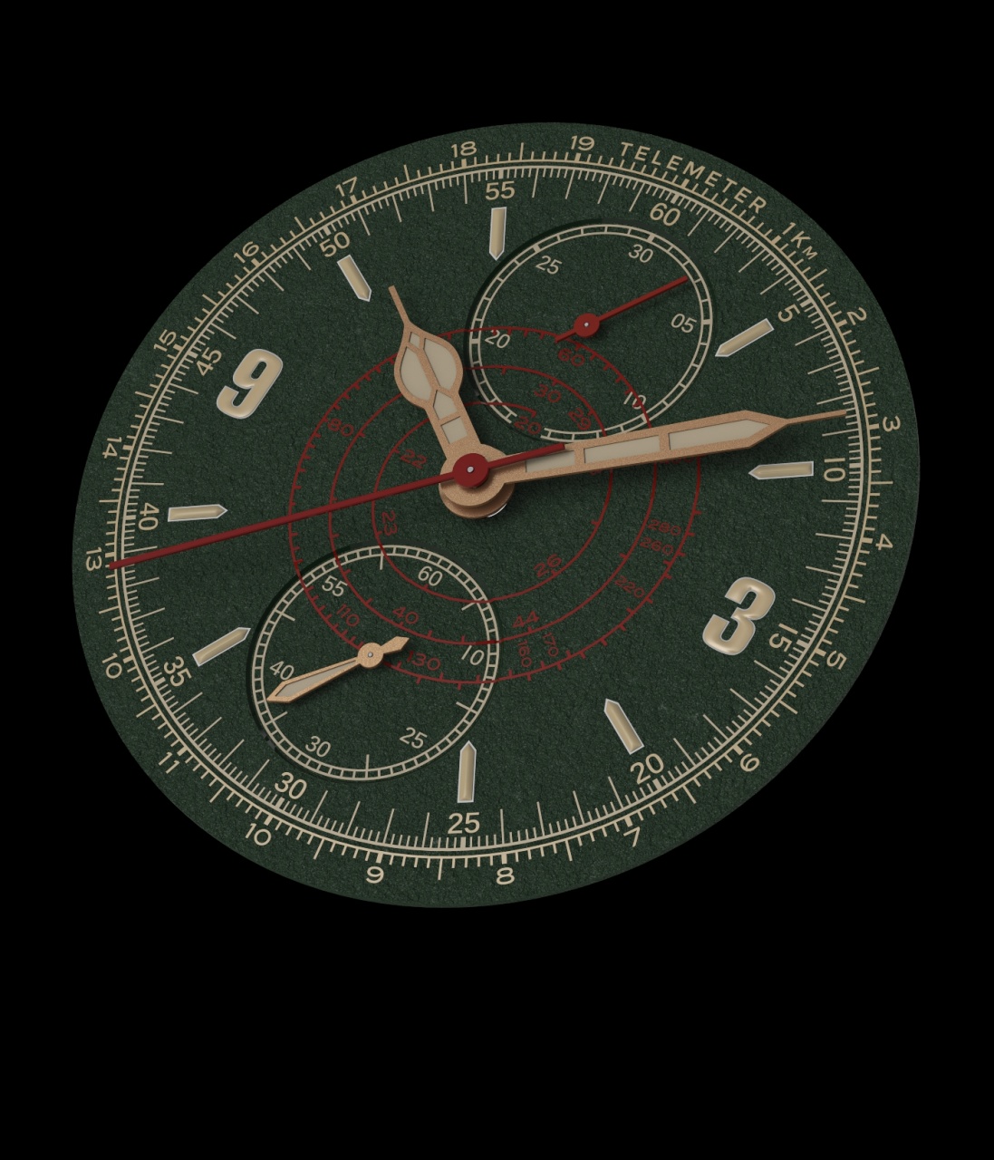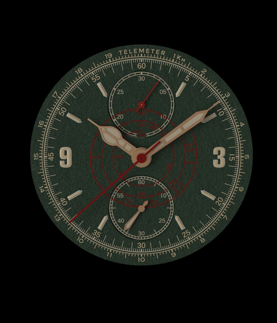 4. Разделение часовых стрелок и стрелок хронографа. Часовые стрелки сделаны из металла с люминисцентным покрытием, в свою очередь стрелки хронографа выполнены с красным цветом. Это сделано для того, что бы при беглом взгляде на часы, можно было сразу идентифицировать время. Также пушер запуска хронографа выделен красной полосой, с целью визуального единства со стрелками хронографа.