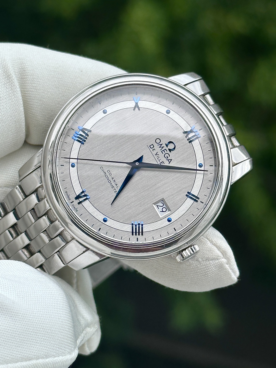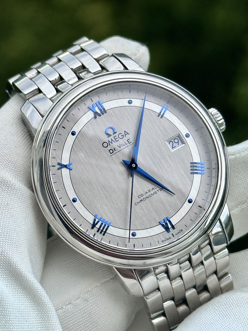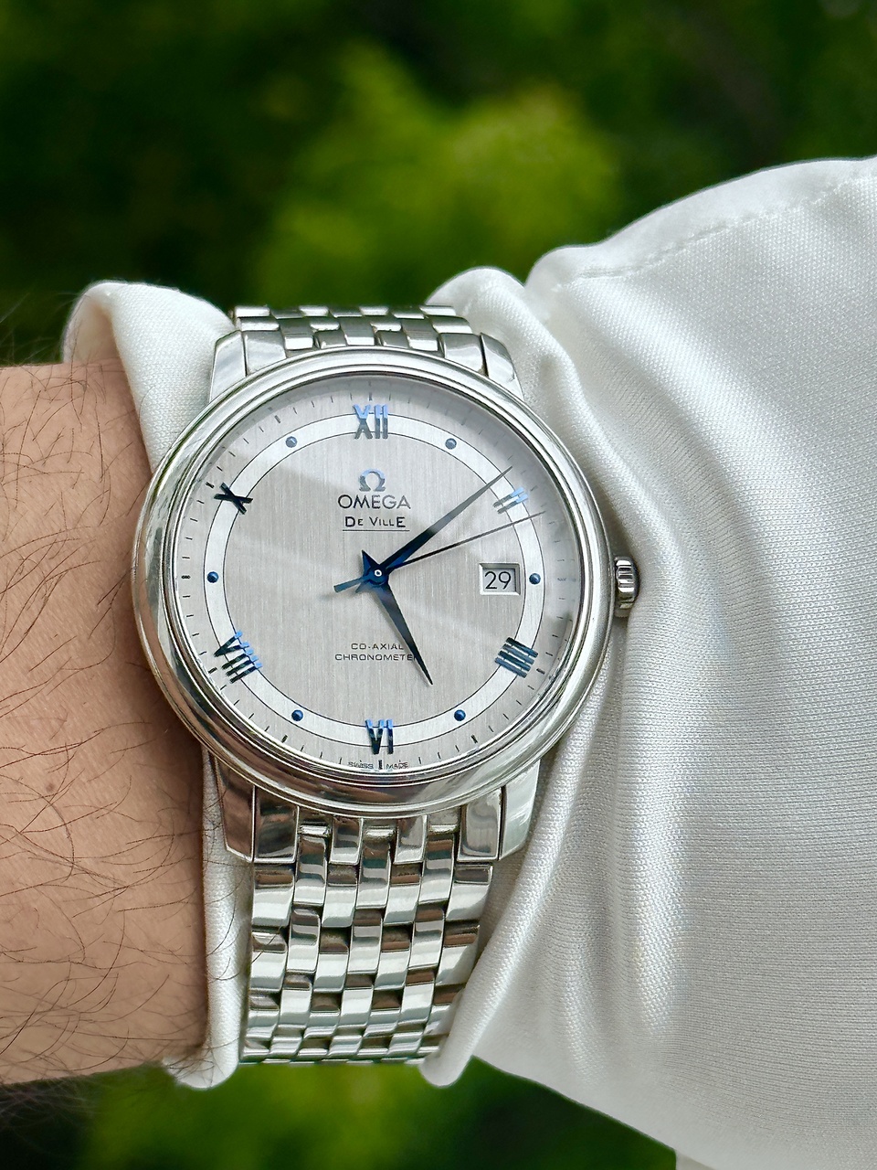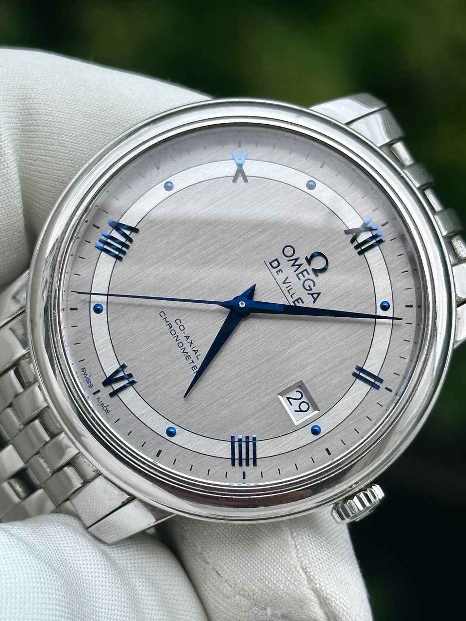 коаксильный девиль из актуальной линейки. Красивое сочетание родиево-серебристого циферблата с глубоким вертикальным сатинированием, центральным диском с круговым сатинированием и внешней минутной шкалой с полированными кабошонами.