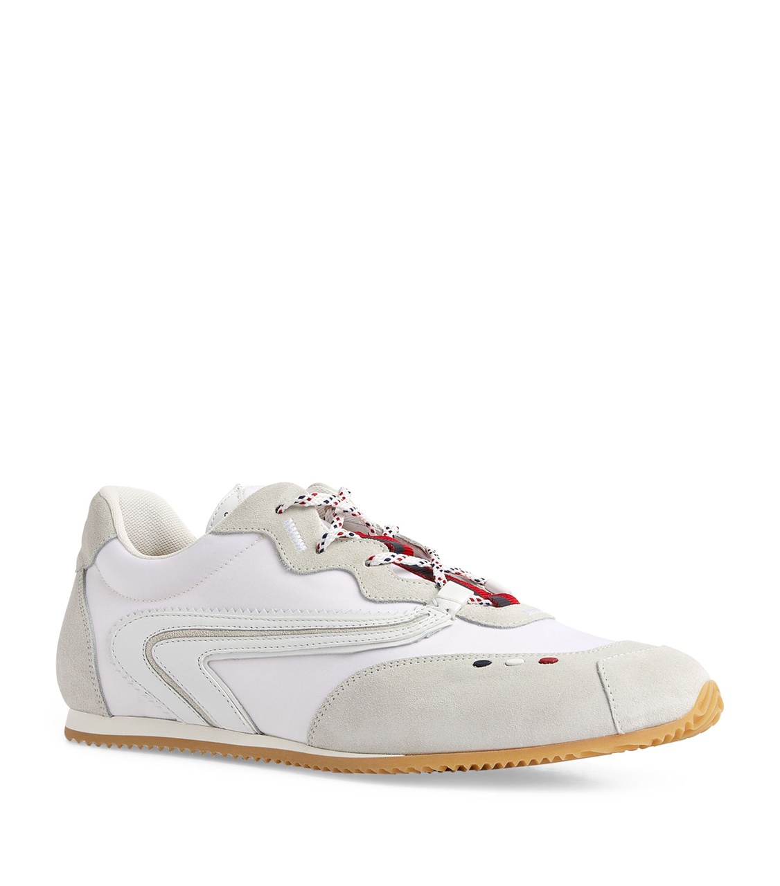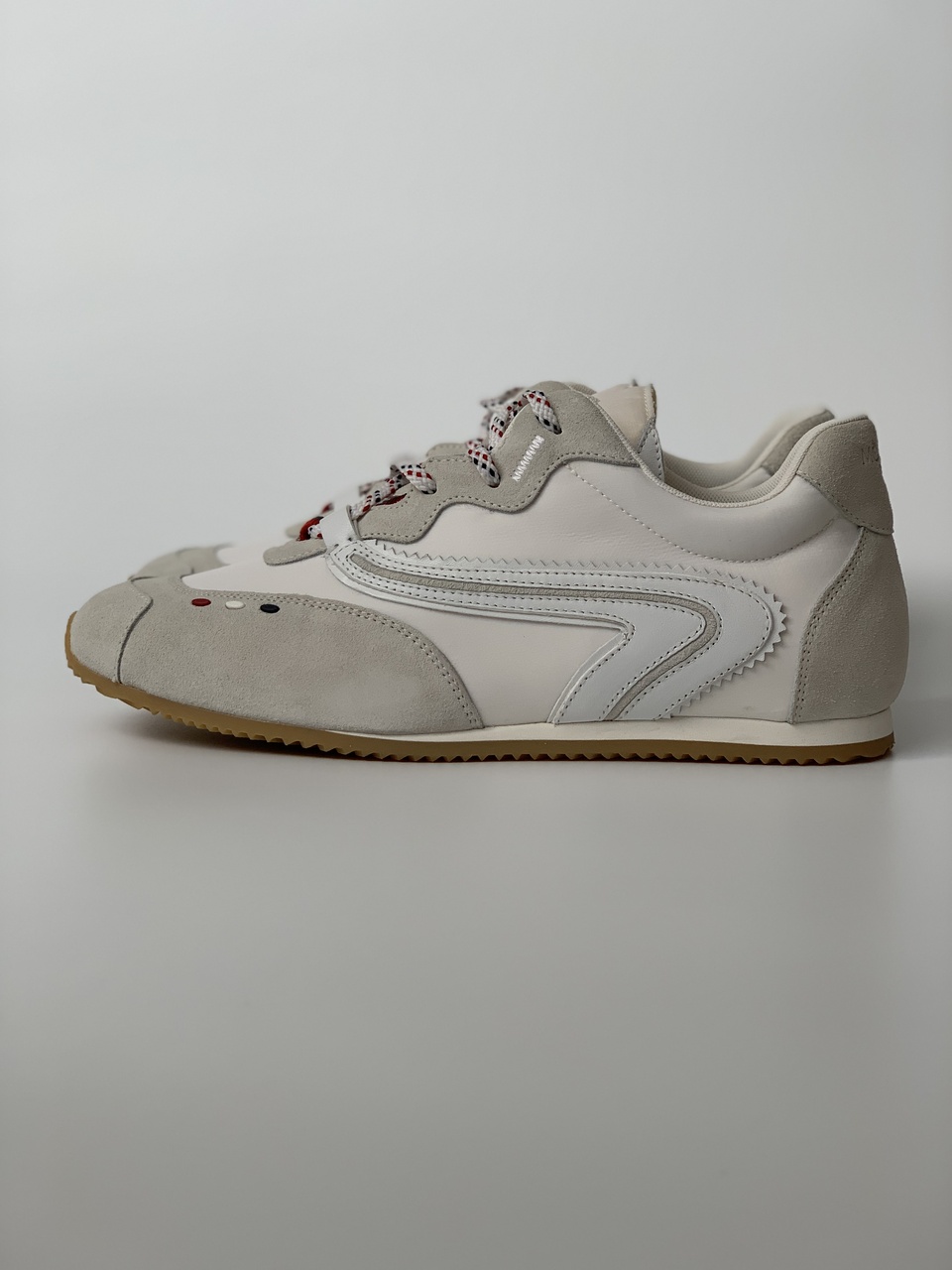 Модель,выполненная за счёт сочетания бархатистой замши,водостойкого нейлона и гладкой кожи,характеризуется шнуровкой,отделанной трёхцветной лентой,и дополняется шнурками,заимствованными у обуви для трекинга.