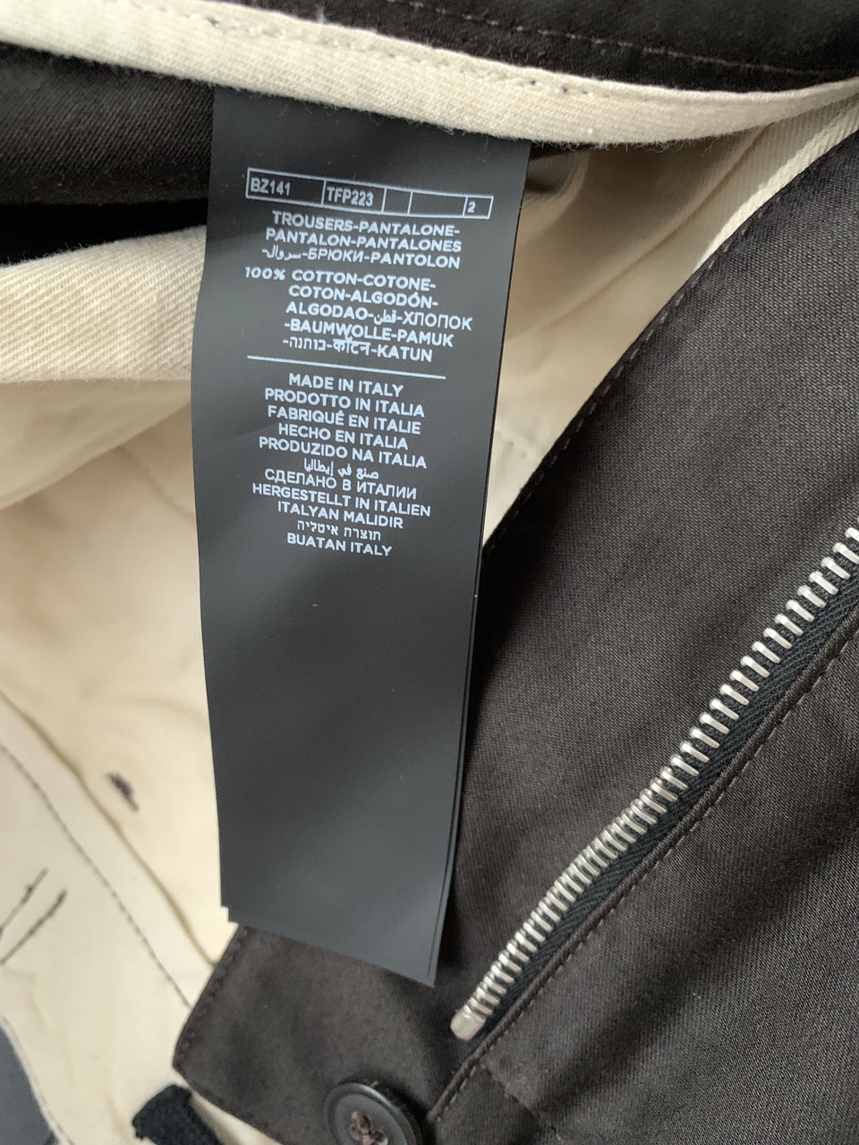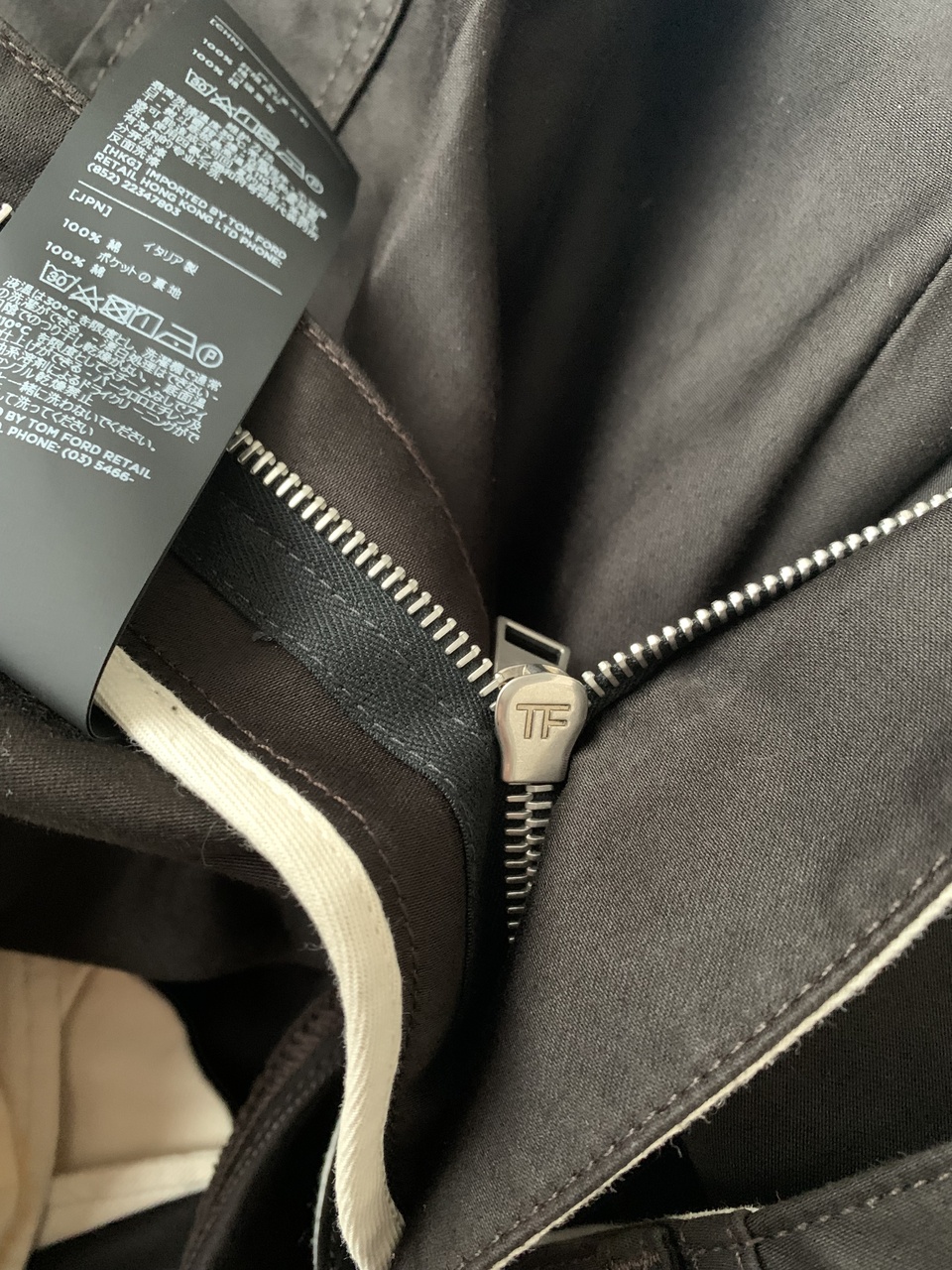 К созданию тёмно-коричневых карго Tom Ford подошёл с максимальным вниманием к комфорту.Модель выполнили так,чтобы она повторяла силуэт тела:за это отвечают защипы в области коленей.Заниженная линия шага не сковывает движения,а мягкий плотный хлопок не перегревает тело.