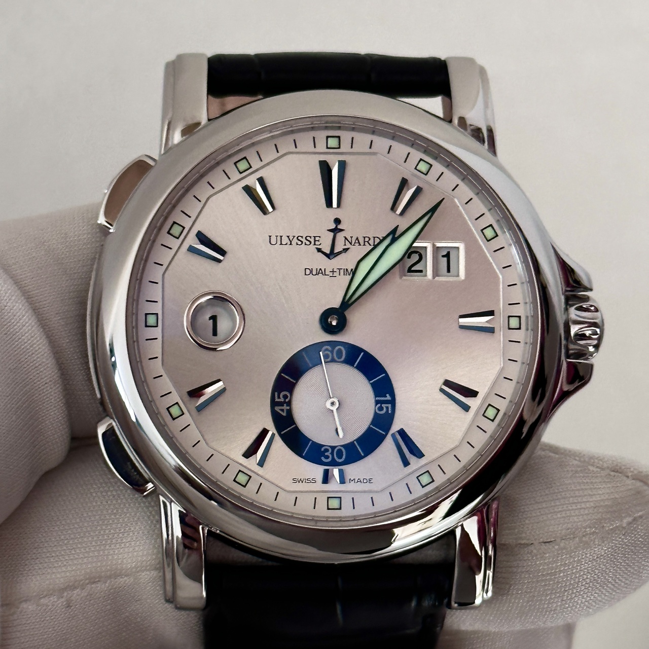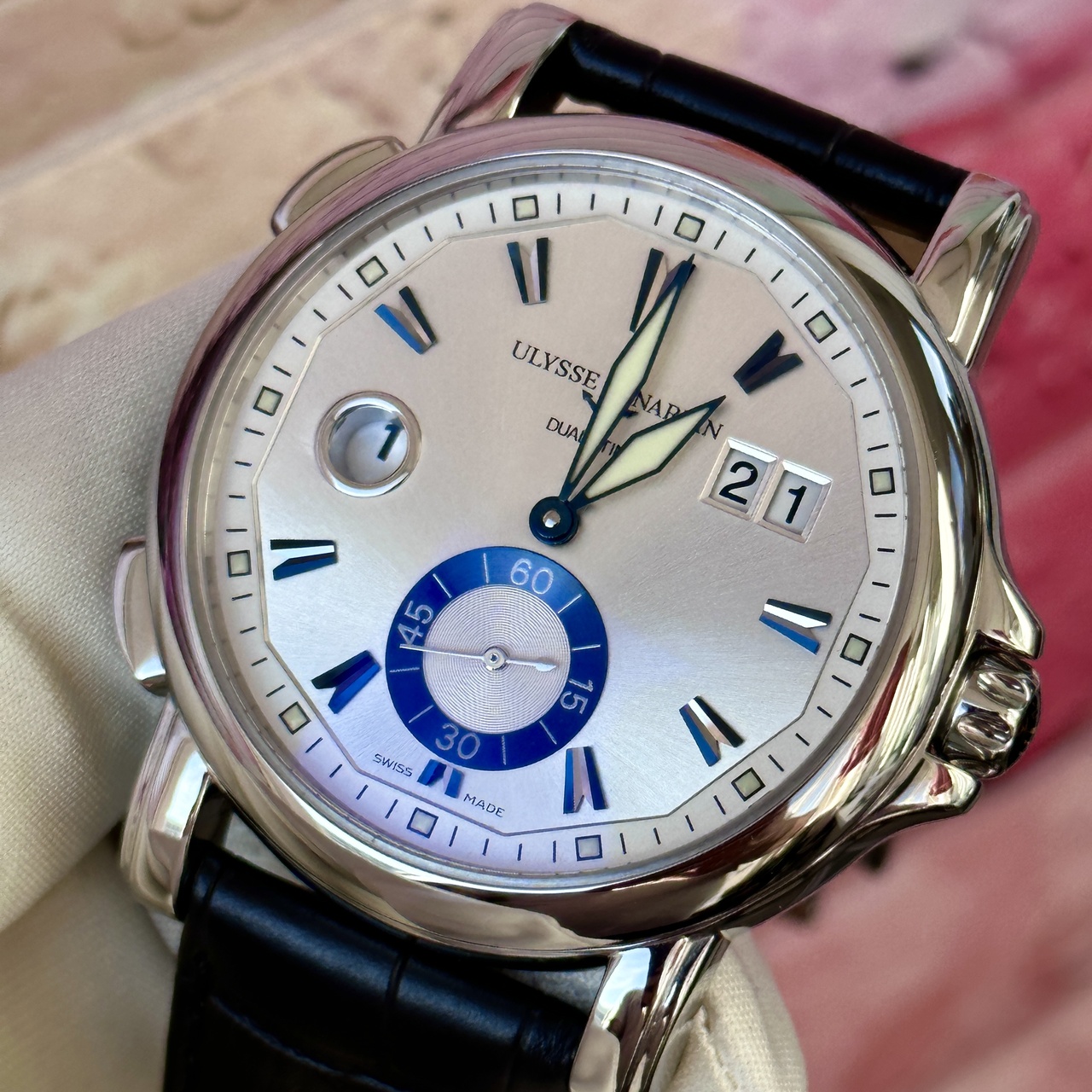 В дизайне и механизме мужских часов от Ulysse Nardin модельного ряда Functional соблюдены все современные тенденции часового дела. Эта удивительная смесь порождает новый стиль часов, основанный на вековых традициях, получивших современную интерпретацию. Индикатор расположенный на циферблате часов, позволяет отображать время одновременно для двух разных часовых поясов. За это волшебство отвечает автоматический калибр — UN-24. При помощи двух изящных кнопок, расположенных с левой стороны корпуса вы сможете легко регулировать часовой счетчик. Несмотря на всю его сложность, управлять им элементарно просто. Шедевры из коллекции Dual Time наделят вас удивительной способностью быть в любой точке планеты. Искусные мастера максимально упростили процесс определения второго часового пояса оснастив часы уникальным корректировочным механизмом который работает в связке с указателем домашнего времени. Произведя необходимые корректировки, вам остается лишь прочесть цифру.