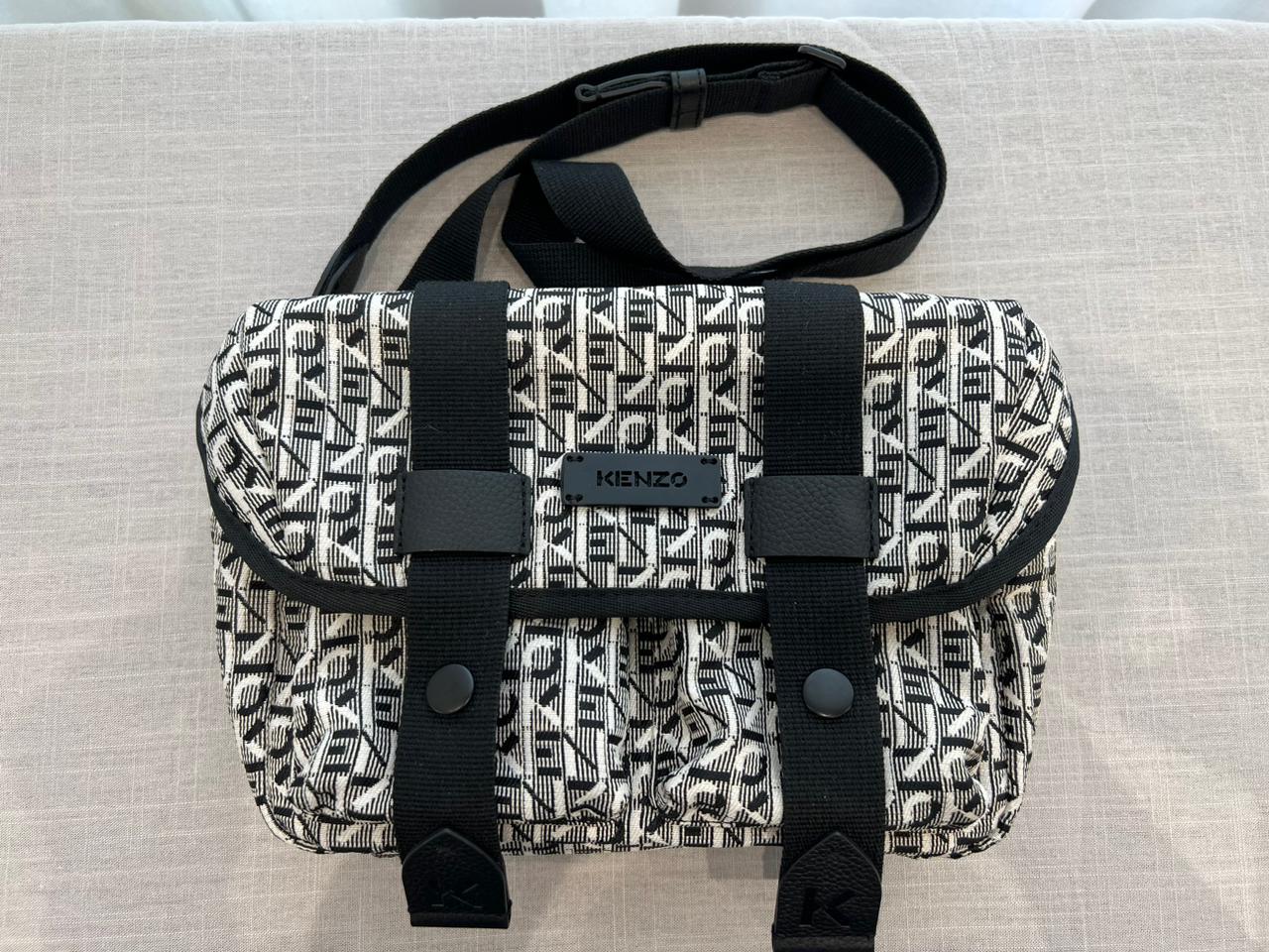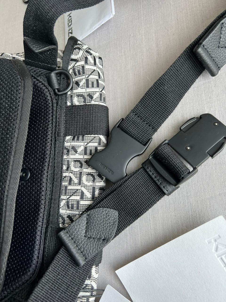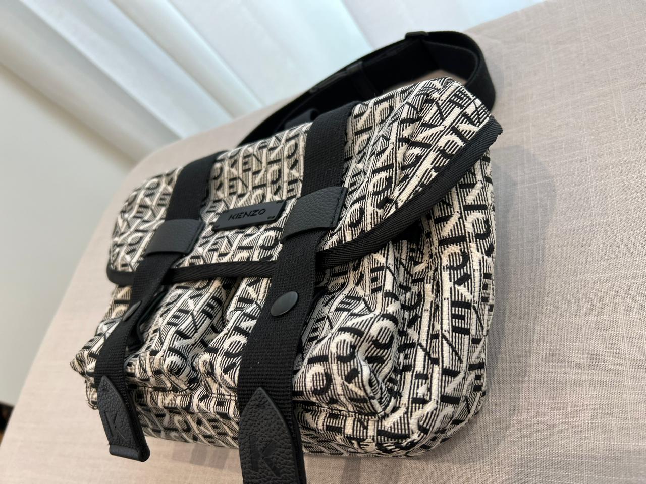 2 ремня в наличии!!! Через плечо прицепной с помощью металлических карабинов с фирменными надписями KENZO и второй ремень поясной с металлической застежкой, он пришить к сумке и прячется в задний карман сумки под застежку липучка.