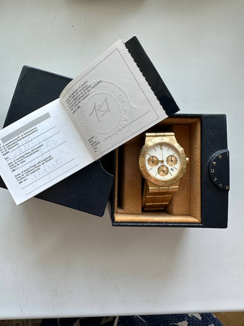 Доброго времени суток. Золотые часы Bulgary Diagono. Часы были куплены нами новыми в Bulgary of America. Есть оригинальная коробка и документы. Почти не носились ( практически в идеальном состоянии — крайние лет 20 вообще лежали в сейфе). На Ebay есть за 15500 € без документов и коробки в Германии
