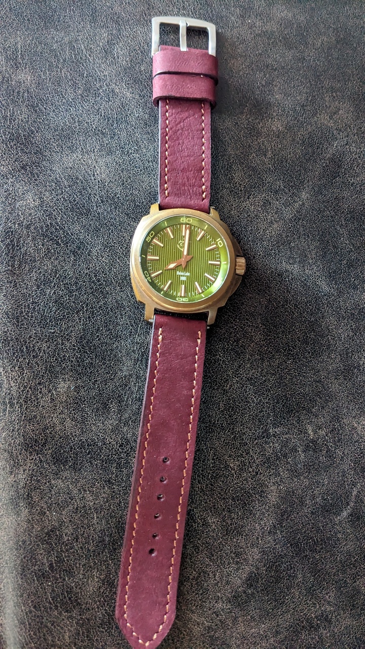 По комплекту: сами часы, родной мягкий тревел-кейс на молнии, два оригинальных ремешка(светлый абсолютно новый, тёмный надевал раз 5-7 от силы) с оригинальными баклями(скорее всего латунь)+ оригинальная бронзовая бакля. Дополнительно три новых ремешка ручной работы на все случаи жизни и на смену настроения и внешнего вида часов+ новый кожаный чехол ручной работы. Комплект реально хороший получился.