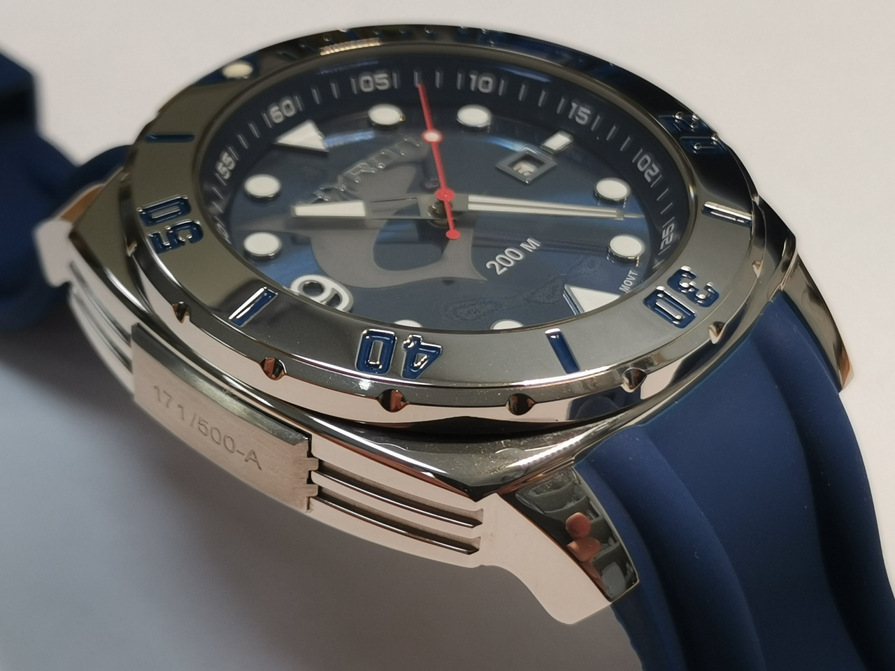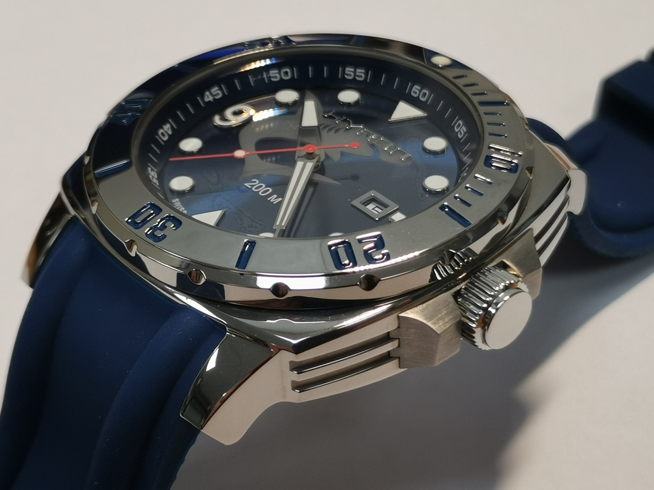 У этой модели есть много положительных качеств, первое и главное из которых, это швейцарский механизм Sellita 215-1, с завораживающе плавным ходом секундной стрелки. Оформление циферблата выполнено довольно приятно. Я выбрал синий цвет, так как, на мой взгляд, в этом варианте часы выглядят наиболее гармонично. Синие шелковые переливы напоминают кадры из подводной хроники жизни морских глубин, - а нарисованная темно серой краской акула в верхней части циферблата, как раз и наводит на эту мысль. Часовой индекс на 9 часах, выполнен в виде арабской цифры, шрифтом напоминающим таковые индексы у швейцарских марок: Tudor, Certinа и прочих. Стрелки, несмотря на лаконичность прямых линий можно назвать оригинальными, хотя мысль о некотором сходстве с легендарными Востоковскими Нептунами не покидает меня. В целом обработка корпуса выполнена на хорошем уровне, полировка, сатинирование - претензий к ним нет. Хочется похвалить и ремешок, выполненный из силикона, он широкий и хорошо прилегающий к руке. С декоративной точки зрения ремешок интересен полусферическими в сечении наплывами идущими вдоль краёв, они визуально разгружают массивный корпус часов. Бакля ремешка массивная, напоминает таковую у модели Молния-Танк.