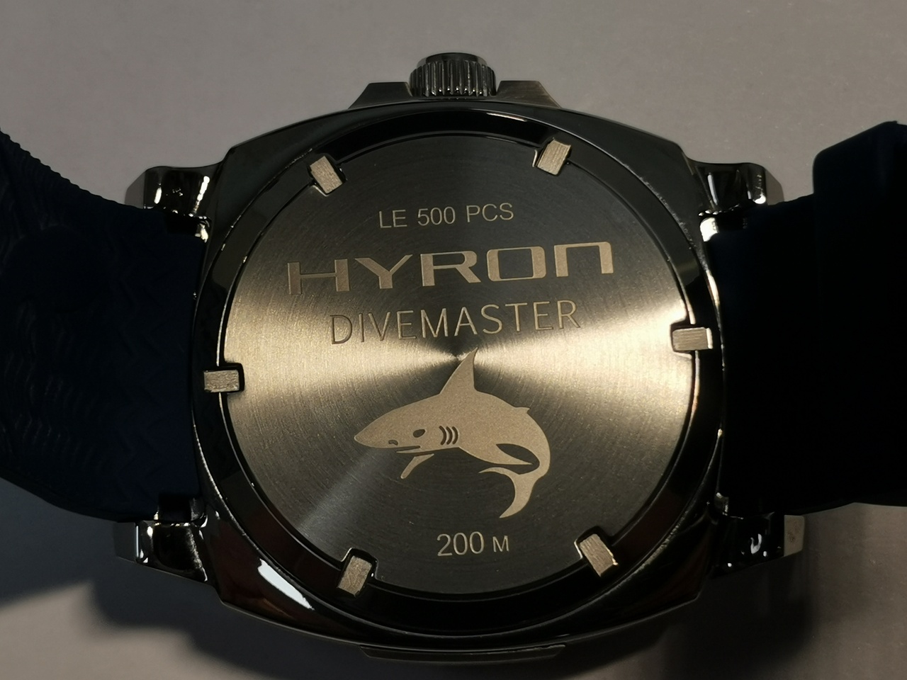 Задняя крышка завинчивающаяся, плоская, слегка приподнятая. Наклонная фаска полирована, основное поле крышки сатинировано. На крышке имеются гравированные надписи: LE 500 PCS, HYRON, Divemaster, изображение акулы, 200 m.