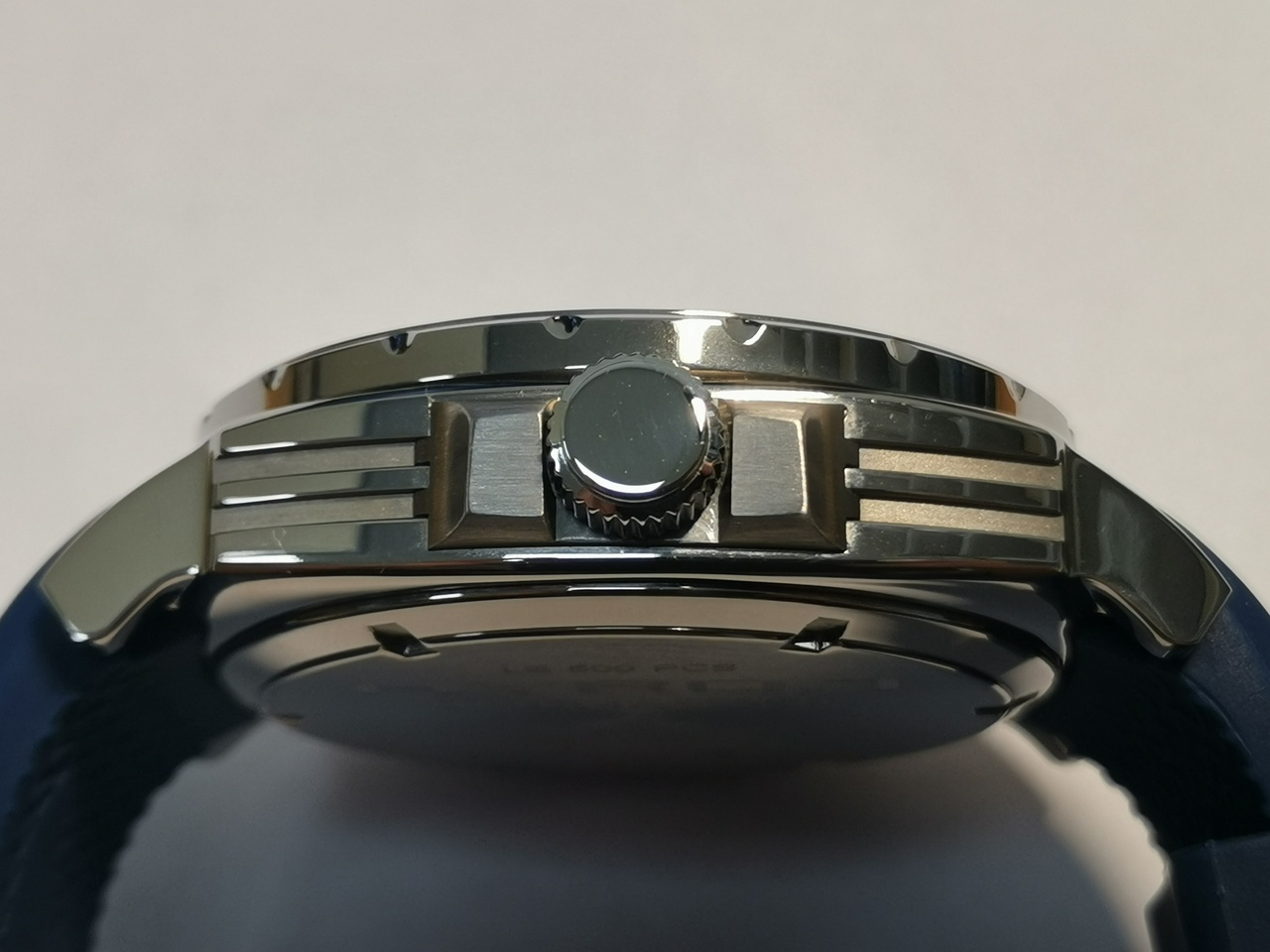 Но, добавлю и ложку дёгтя. Казалось бы, при всех вышеперечисленных достоинствах, неужели у этих часов из лимитированной коллекции, могут быть недостатки? А они есть и я их сейчас перечислю: В первую очередь это лицо часов - безель. Ход его тугой и неравномерный с существенным ходом назад. Безель не попадает ровно в метку соответствующую полудню, и это очень заметно. Возможно, если отказаться от треугольных часовых обозначений на безеле и циферблате, этого можно было бы избежать, сгладив несоответствие. Краска синего цвета (или паста) заполняющая глубоко гравированные основные минутные обозначения на безеле, нанесена не аккуратно. Под лупой видны наплывы краски за границы цифр, пузыри и сколы по поверхности краски. Декоративные элементы корпуса в виде наплывов защищающих заводную головку и наплыв-шильдик с номером экземпляра, не являются частью монолитного корпуса. Эти элементы прикреплены к корпусу механически. Проблема заключается в том, что крепление декоративных элементов произведено без должного качества, это заметно по щелям между телом корпуса и основанием декоративного элемента. Я обратил на это внимание, когда заметил, что декоративные элементы собирают по периметру своего основания, мелкие волоски, ниточки, ворс, которые забиваются в вышеописанные щели, и торчат иногда пучками.