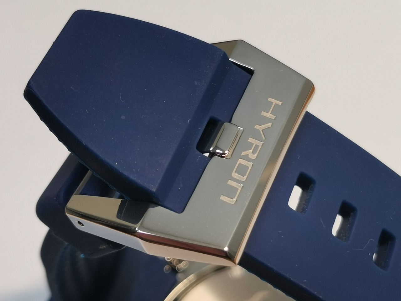 Силиконовый ремешок средней жесткости снаружи изображений не имеет. С внутренней стороны ремешка расположены на текстурном фоне напоминающем протектор шин - надпись HYRON и изображение акулы.