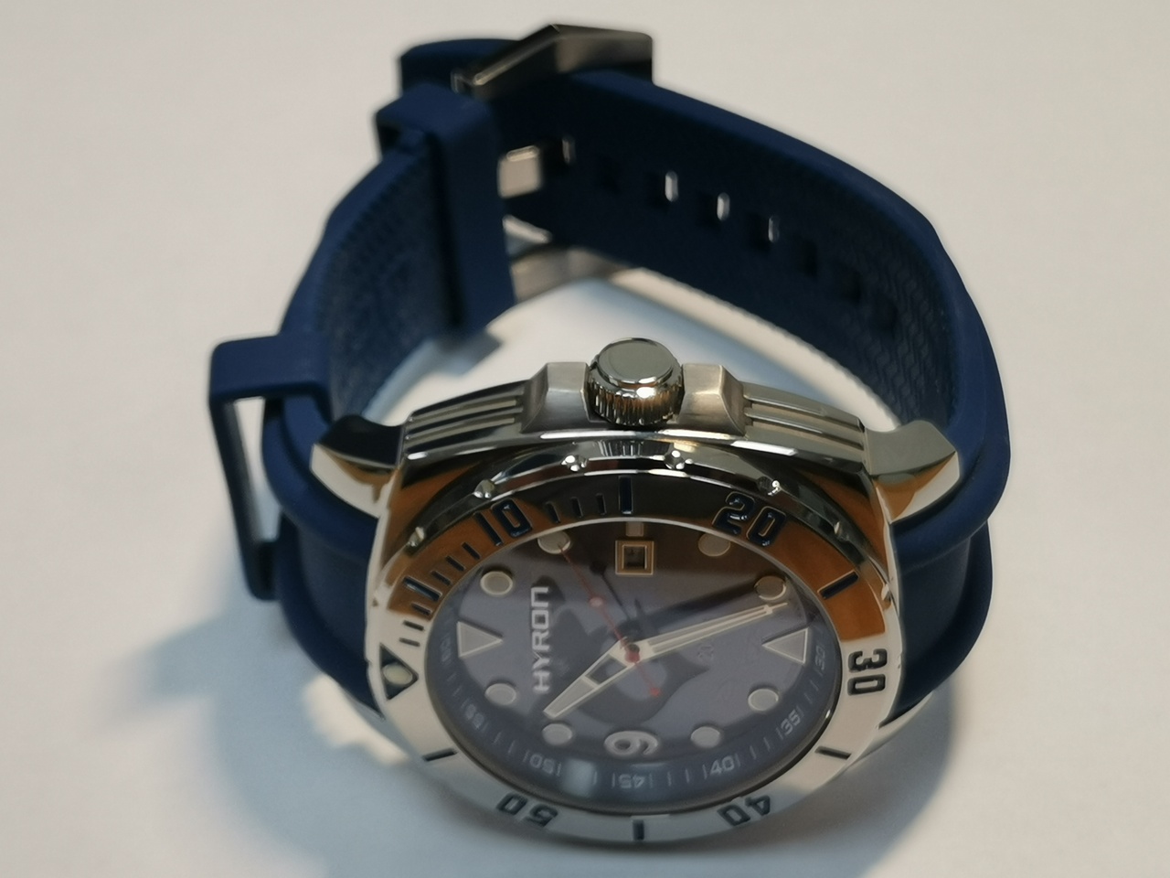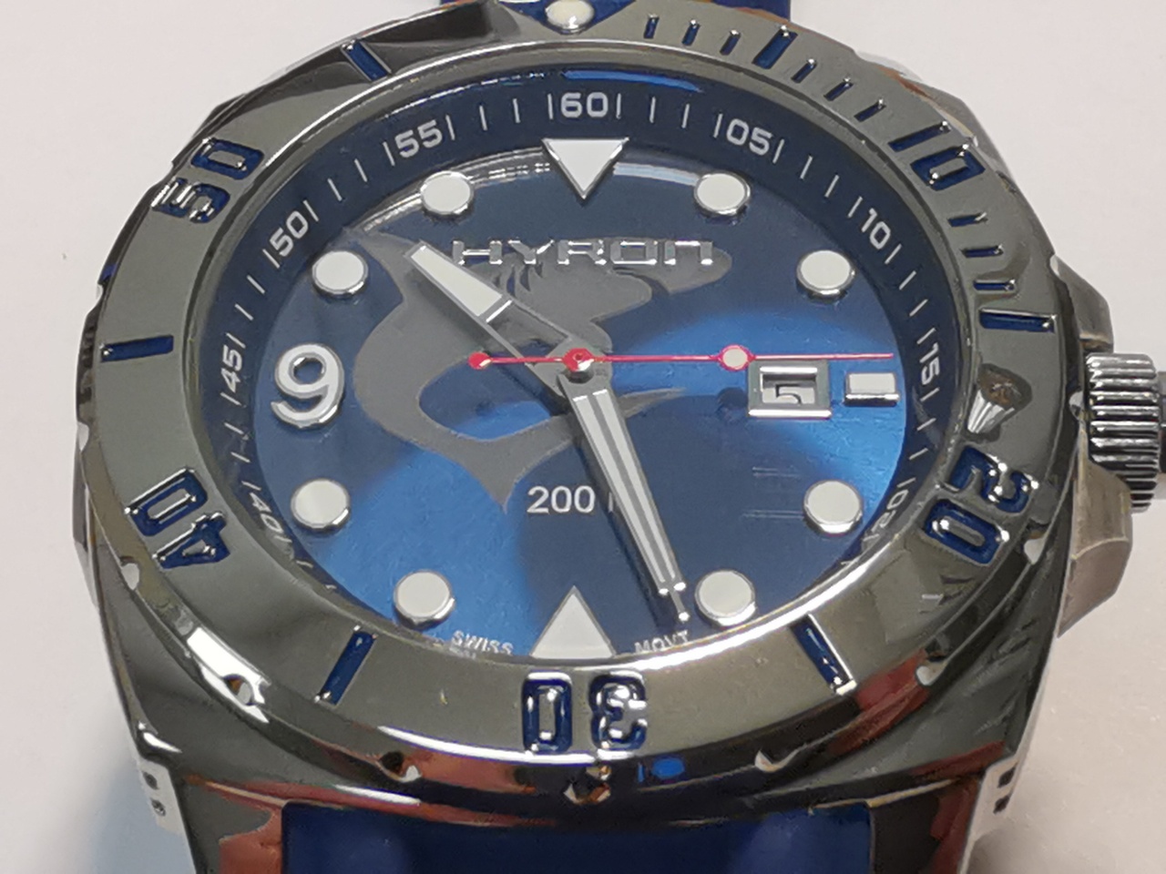 Циферблат глубоко посаженный, синий, имеет шелковую обработку поверхности "солнечные лучи", переливается красиво. Часовые метки в виде хромированных оправок заполненных средненьким люминофором, выполнены в виде кружков, треугольников и цифры 9. Минутная разметка по наклонному кольцу-колодцу выполнена белой краской, довольно крупно с обозначением основных минутных обозначений. На поле циферблата имеется изображение акулы в динамичном развороте, выполненное слабо светящейся серой краской. Накладными хромированными буквами, прямо над акулой выложено брендовое имя HYRON. Окошко даты располагается на 3 часах, оформлено толстенькой хромированной прямоугольной рамкой. Надписи на циферблате: 200m, swiss movt, выполнены белой краской.
