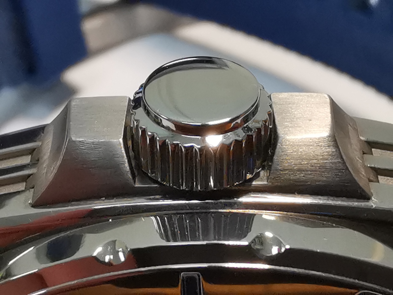 Заводная головка довольно крупная, завинчивающаяся, широкая, цилиндрическая, со легка выступающей полированной плоской верхушкой без надписей. Мелкими вертикальными зубчиками покрыто цилиндрическое тело головки. Заводная головка заводит механизм (Sellita 215-1) полностью за 23 оборота. Перевод даты и времени осуществляется выдвижением головки на соответствующие высоты.