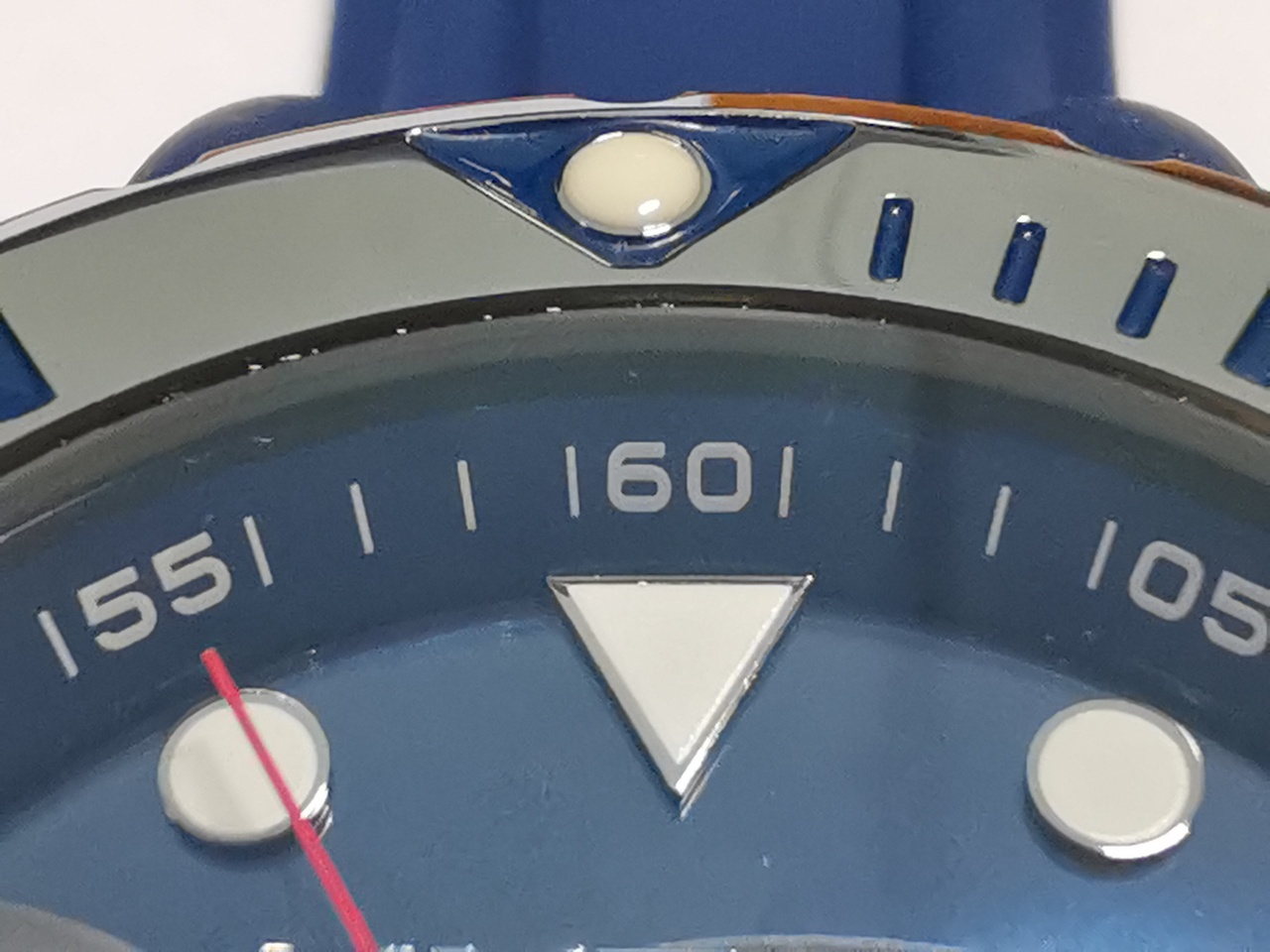 Далее, между циферблатом и стеклом имеется пластиковое наклонное кольцо с минутной разметкой. Под определенным углом можно заметить в верхней части циферблата следы облоя на нижней части кольца прилегающей к циферблату. Сам циферблат, несмотря на красоту, при повороте в сторону источника света, - выдает несовершенство технологического процесса(видимо сушки краски или лака) в виде зонально раскиданной по всему полю циферблата побежалости напоминающей бензиновые пятна на лужах.