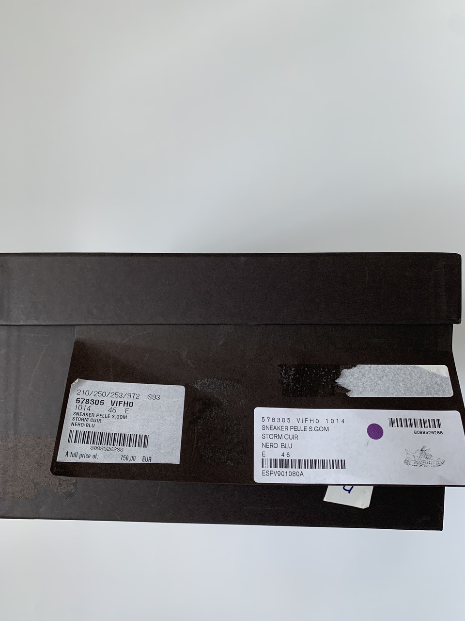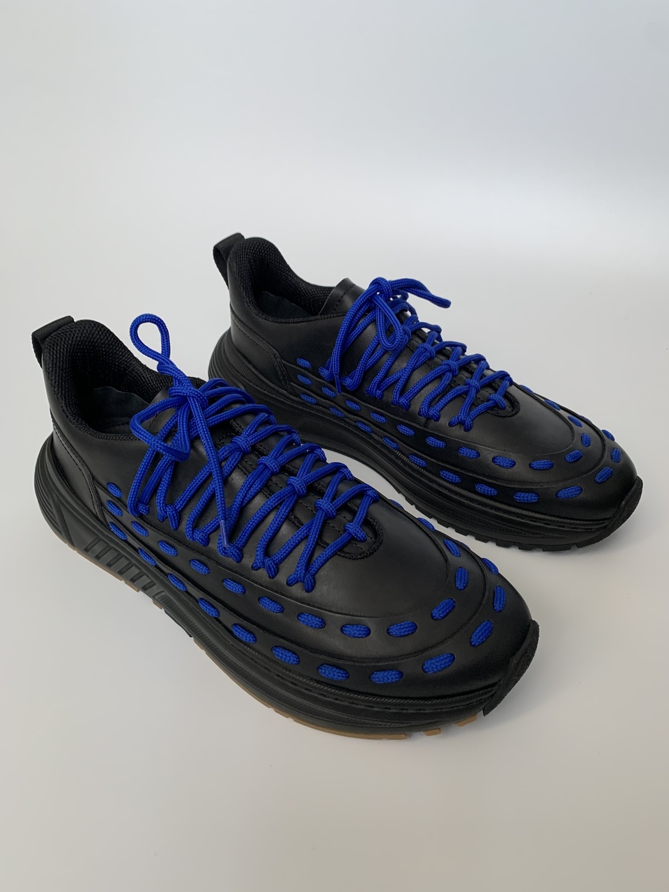 Чёрные кроссовки не выглядят просто благодаря шнуровке оттенка синий электрик и двойному стичингу ей в тон.Обувь изготовили из гладкой матовой кожи растительного дубления,поэтому она получилась особенно мягкой и эластичной.