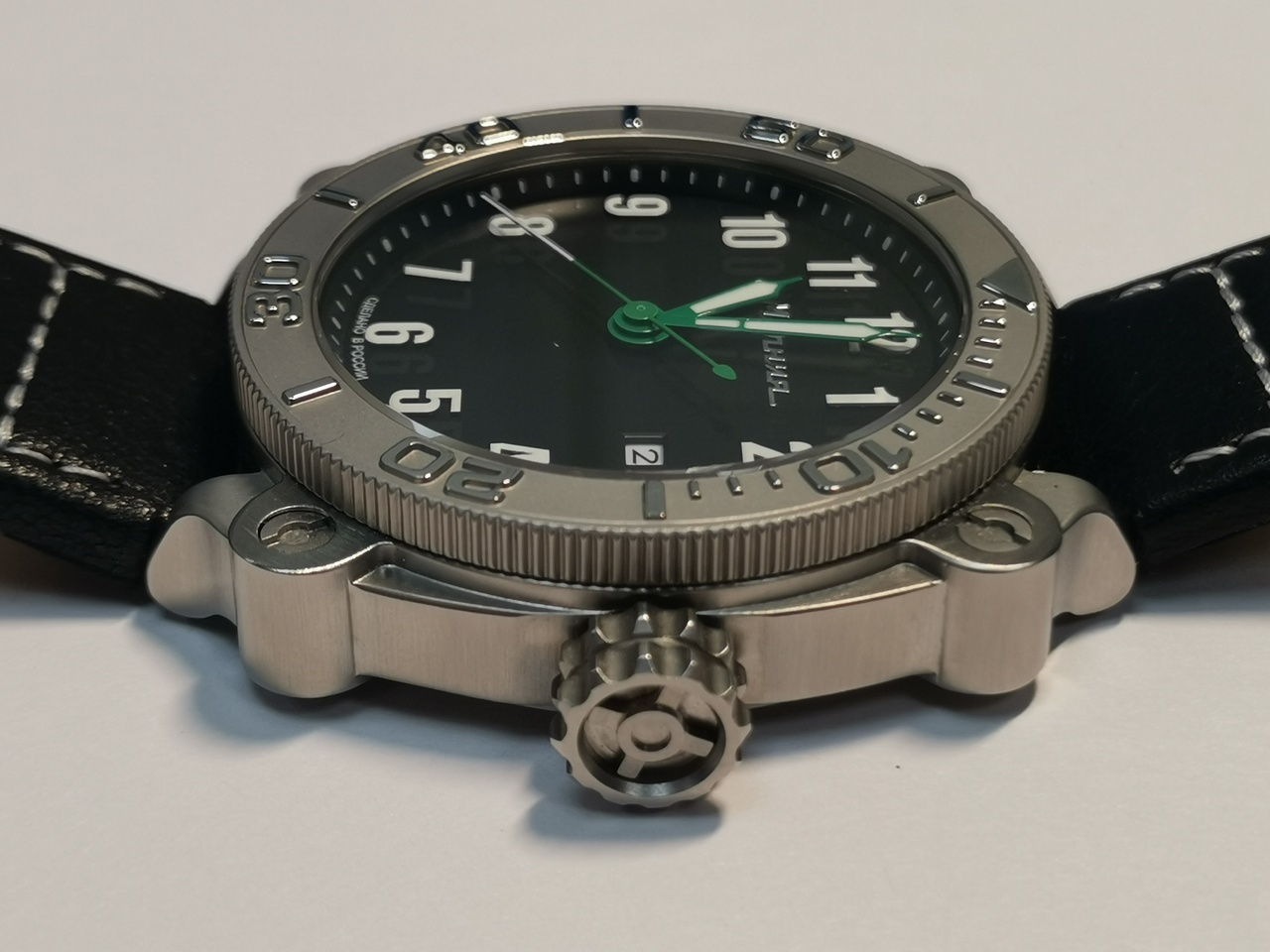 И, наконец, завершает облик часов установленный кожаный ремешок. Он трехслойный с красивым верхним слоем из несколько жестковатой, покрытой частыми кракелюрами черной кожи. Ремешок имеет интересную прострочку белой нитью, отсылающую к сегментарному делению гусеничной ленты. Судя по тисненой надписи с внутренней стороны ремешка: Genuine Leather, можно предположить, что он изготовлен не в России.