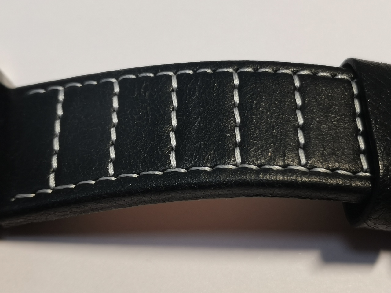 Ремешок установленный на часах имеет быстросъемные шпильки. Изготовлен в основном из кожи, имеет соответствующий запах. Наружная часть ремешка из текстурированной кожи с прострочкой. Прострочка не сквозная. Внутренняя часть напоминает плотную замшу, которая охотно окрашивается в черный цвет при контакте с внешней стороной, при застегивании ремешка.