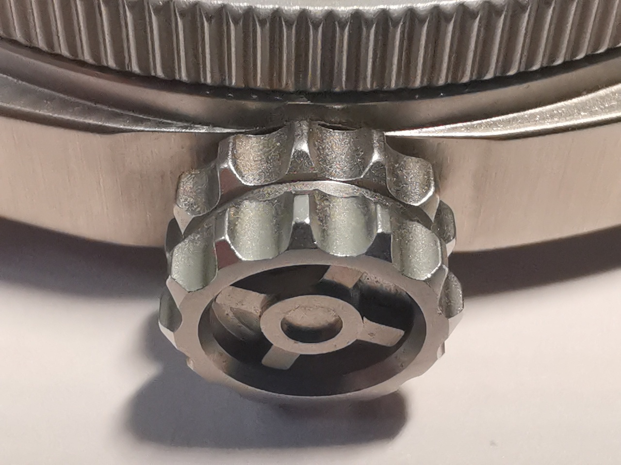 Очень порадовала заводная головка, она крупная, имеет большие зубчики в два ряда, ухватистость великолепная. Верхняя часть головки имеет внутреннее углубление с установленным крестообразным декоративным элементом. С торца напоминает колесо гусеничного транспорта.